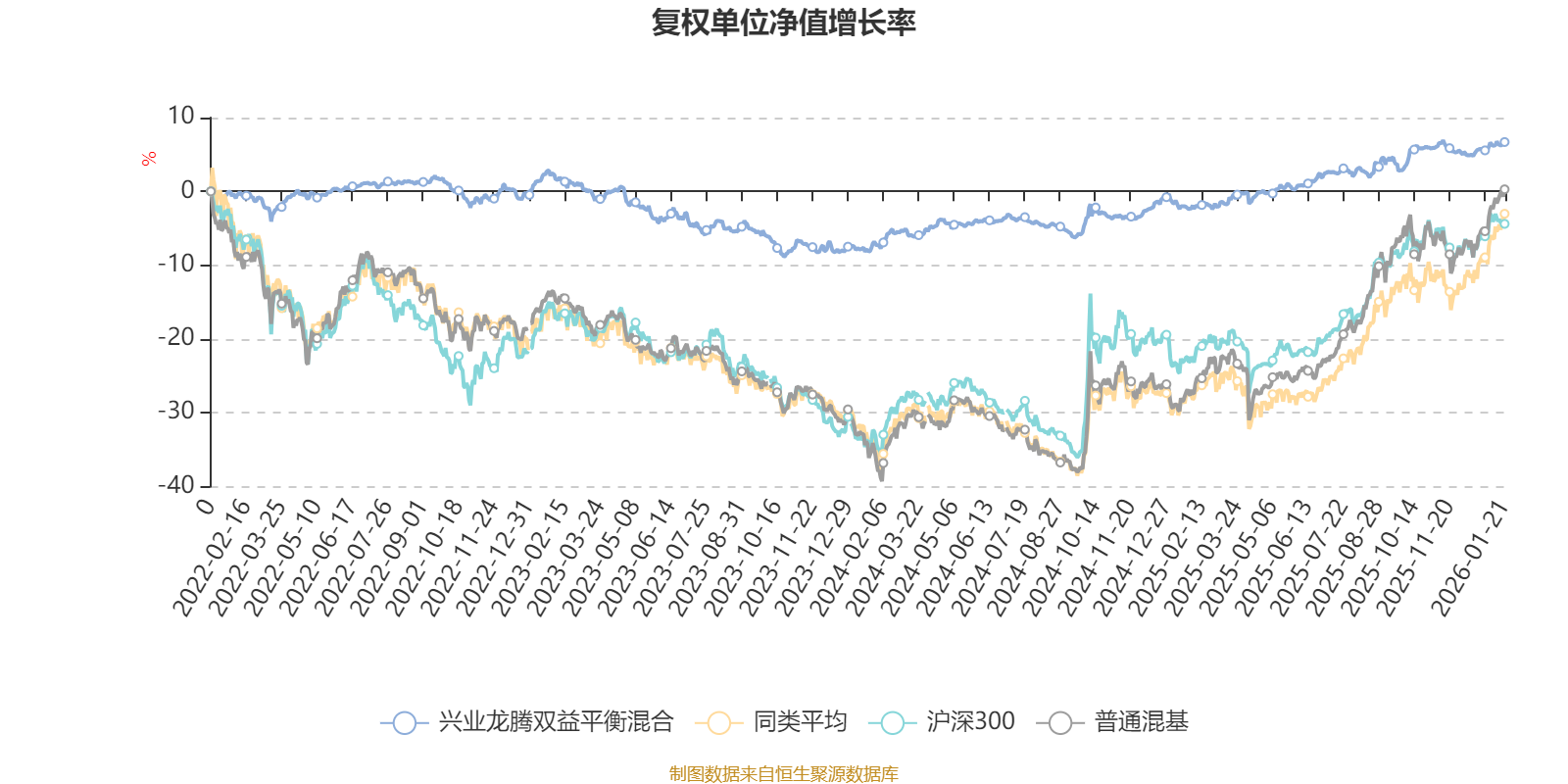 截至1月21日,兴业龙腾双益平衡混合近三个月复权单位净值增长率为0.76%,位于同类可比基金118/134;近半年复权单位净值增长率为3.56%,位于同类可比基金125/134;近一年复权单位净值增长率为9.16%,位于同类可比基金119/131;近三年复权单位净值增长率为3.77%,位于同类可比基金98/124。