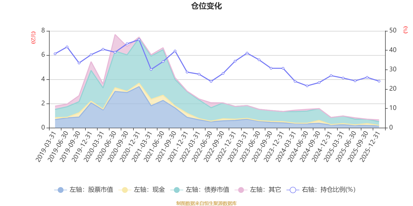 据定期报告数据统计,近三年平均股票仓位为27.59%,同类平均为67.52%。2020年末基金达到45.46%的最高仓位,2024年上半年末最低,为21.66%。