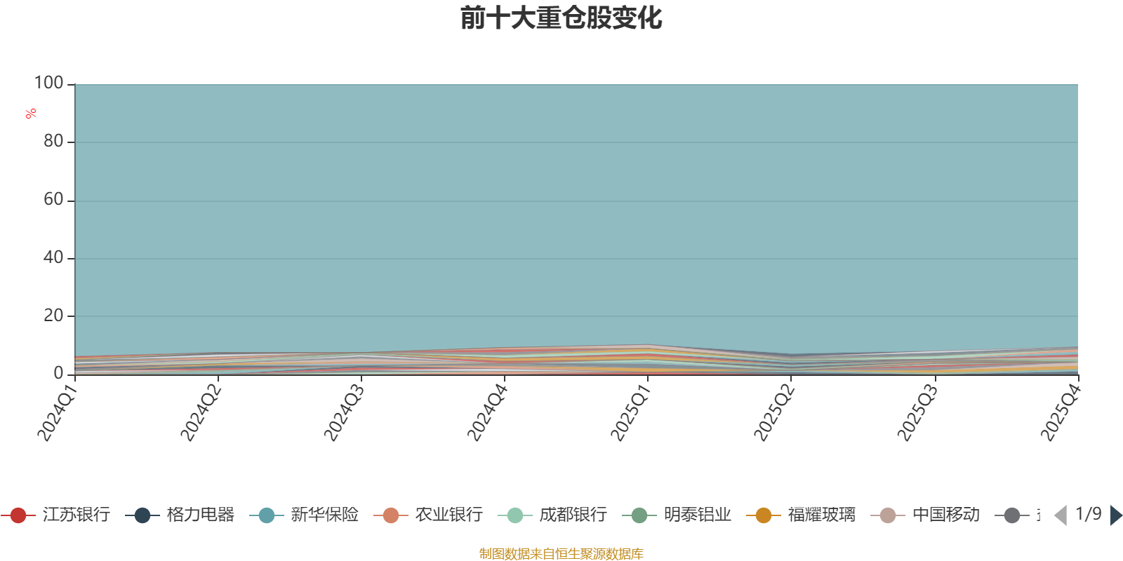 截至2025年四季度末,基金十大重仓股分别是中国移动、福耀玻璃、格力电器、山西汾酒、分众传媒、梅花生物、华夏银行、北京银行、新华保险、江中药业。