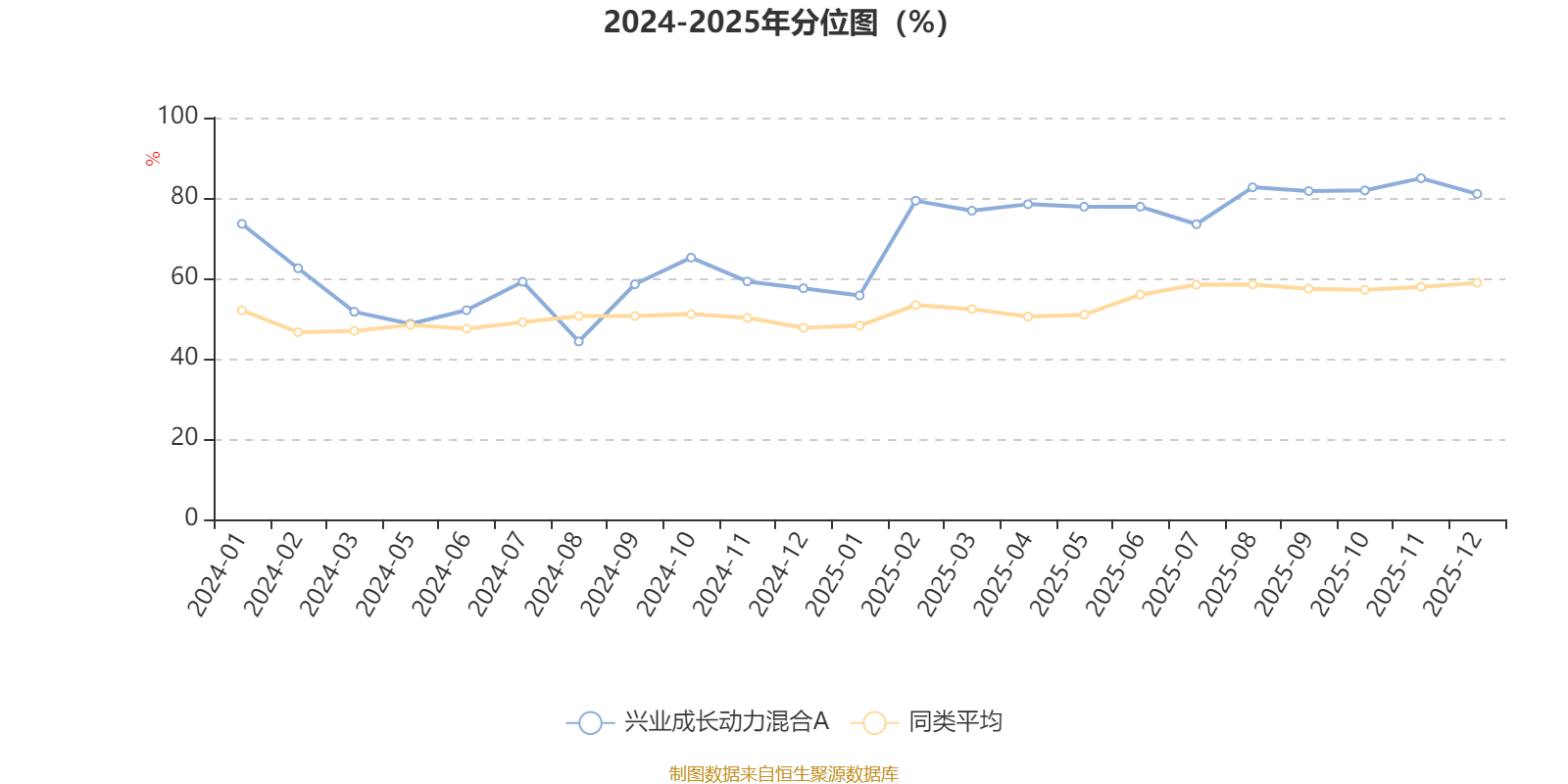 通过所选区间该基金净值增长率分位图,可以观察该基金与同类基金业绩比较情况。图为坐标原点到区间内某时点的净值增长率在同类基金中的分位数。