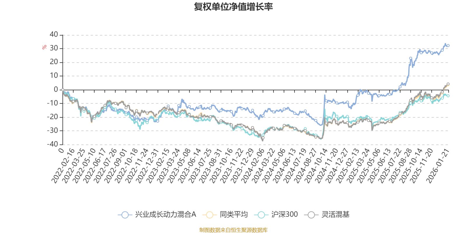 截至1月21日,兴业成长动力混合A近三个月复权单位净值增长率为3.47%,位于同类可比基金925/1286;近半年复权单位净值增长率为29.92%,位于同类可比基金449/1286;近一年复权单位净值增长率为46.28%,位于同类可比基金364/1286;近三年复权单位净值增长率为57.14%,位于同类可比基金134/1286。