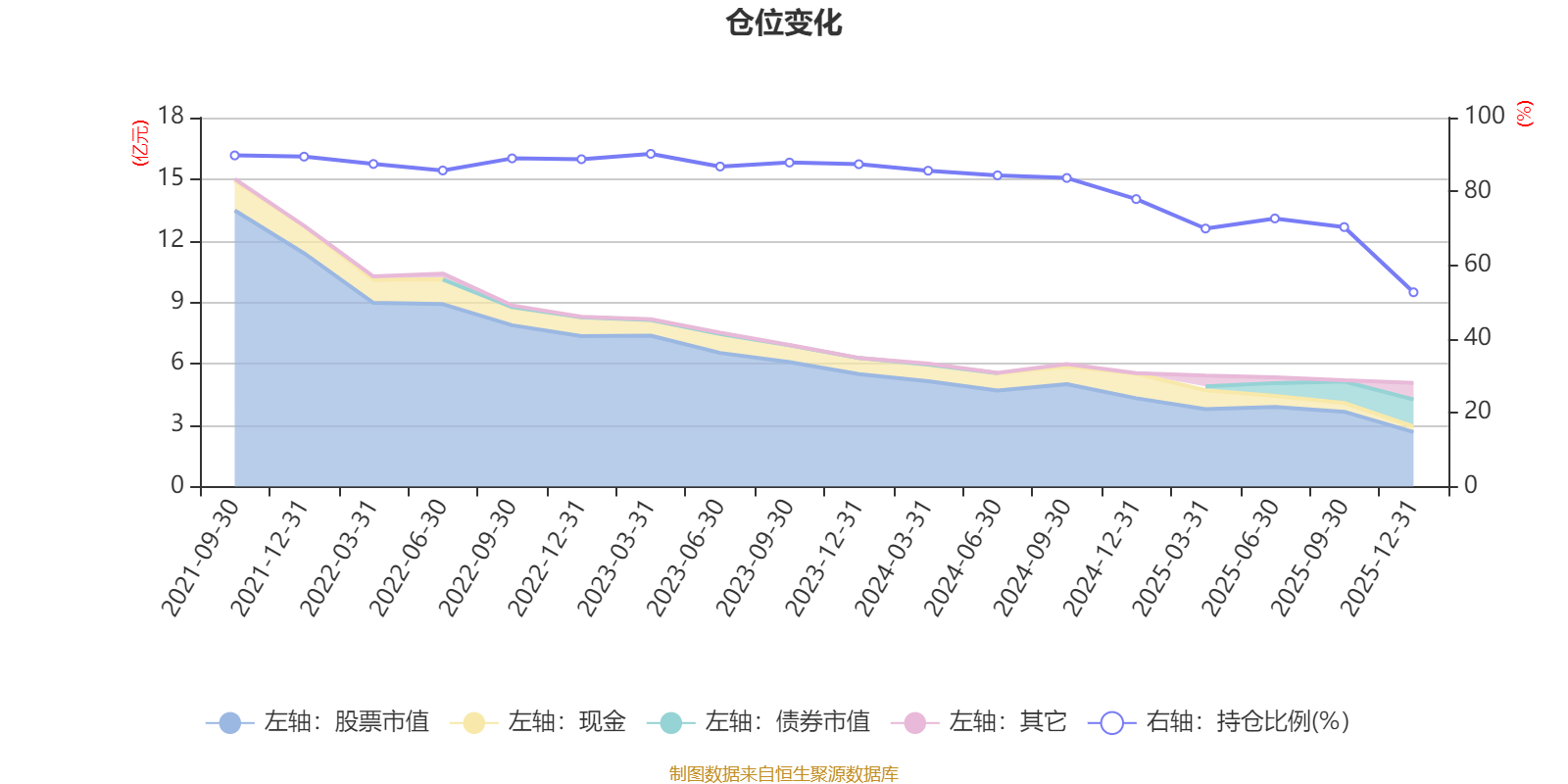 据定期报告数据统计,近三年平均股票仓位为79.1%,同类平均为72.57%。2023年一季度末基金达到90.18%的最高仓位,2025年末最低,为52.66%。