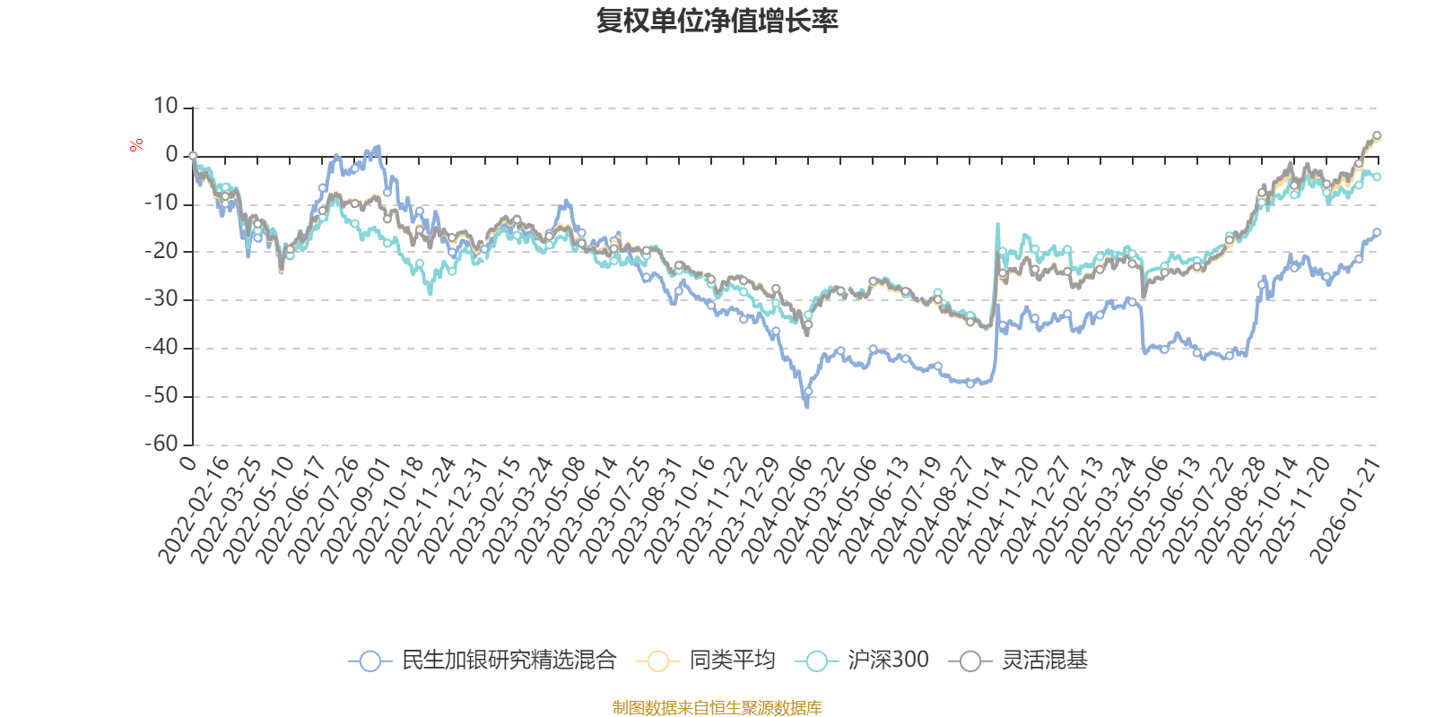 截至1月21日,民生加银研究精选混合近三个月复权单位净值增长率为8.41%,位于同类可比基金618/1286;近半年复权单位净值增长率为44.02%,位于同类可比基金211/1286;近一年复权单位净值增长率为26.26%,位于同类可比基金775/1286;近三年复权单位净值增长率为-1.65%,位于同类可比基金1034/1286。