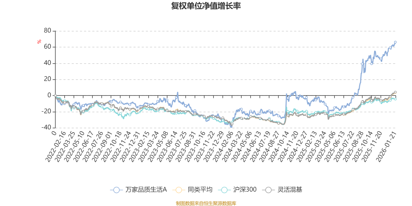 截至1月21日,万家品质生活A近三个月复权单位净值增长率为12.43%,位于同类可比基金372/1286;近半年复权单位净值增长率为69.90%,位于同类可比基金33/1286;近一年复权单位净值增长率为78.16%,位于同类可比基金71/1286;近三年复权单位净值增长率为86.27%,位于同类可比基金47/1286。