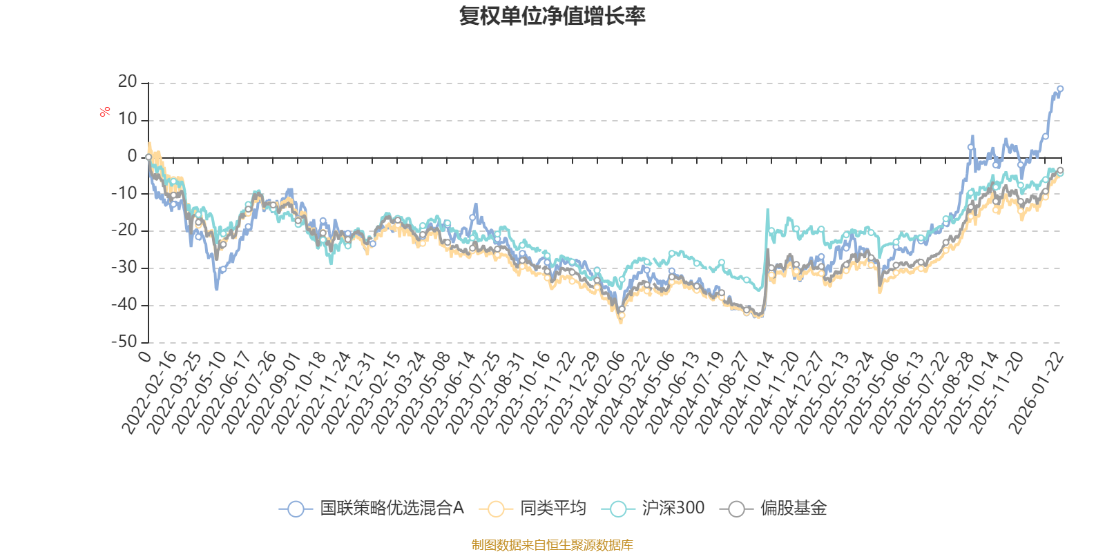 截至1月22日,国联策略优选混合A近三个月复权单位净值增长率为19.58%,位于同类可比基金19/265;近半年复权单位净值增长率为44.07%,位于同类可比基金35/265;近一年复权单位净值增长率为56.02%,位于同类可比基金53/265;近三年复权单位净值增长率为46.44%,位于同类可比基金39/256。