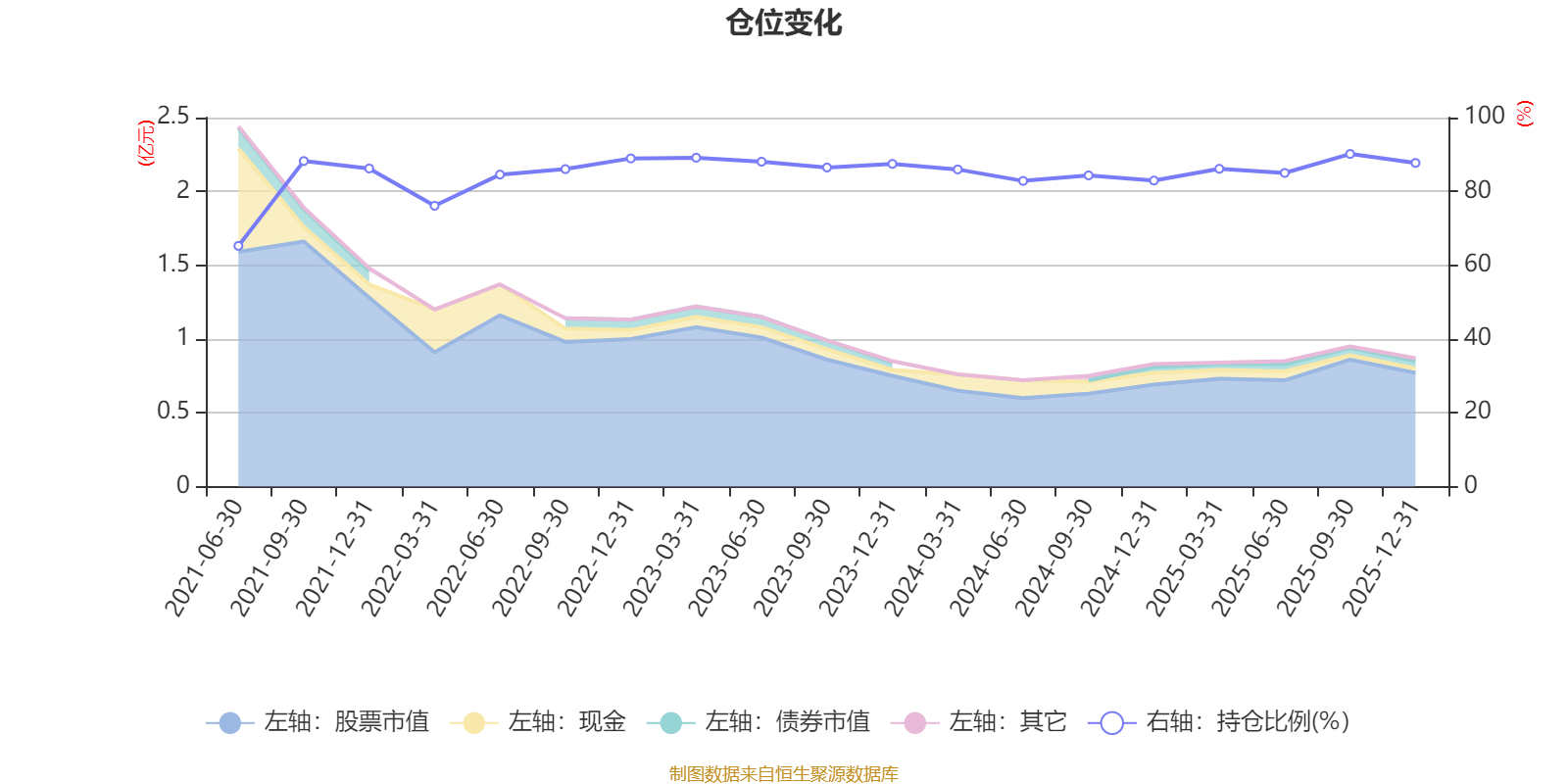 据定期报告数据统计,近三年平均股票仓位为86.35%,同类平均为84.04%。2025年三季度末基金达到90.15%的最高仓位,2021年上半年末最低,为65.23%。