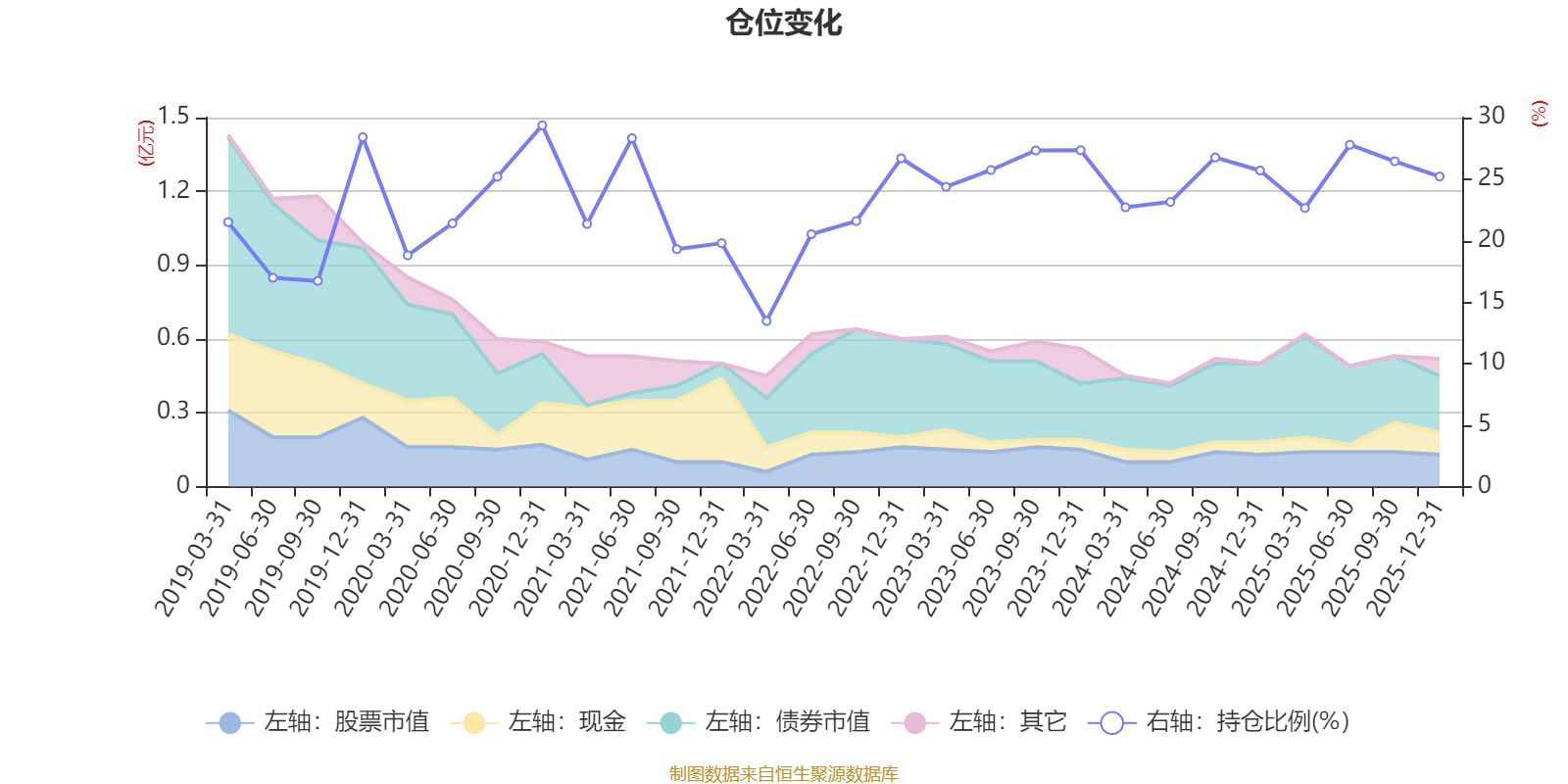 据定期报告数据统计,近三年平均股票仓位为25.43%,同类平均为72.57%。2020年末基金达到29.37%的最高仓位,2022年一季度末最低,为13.46%。