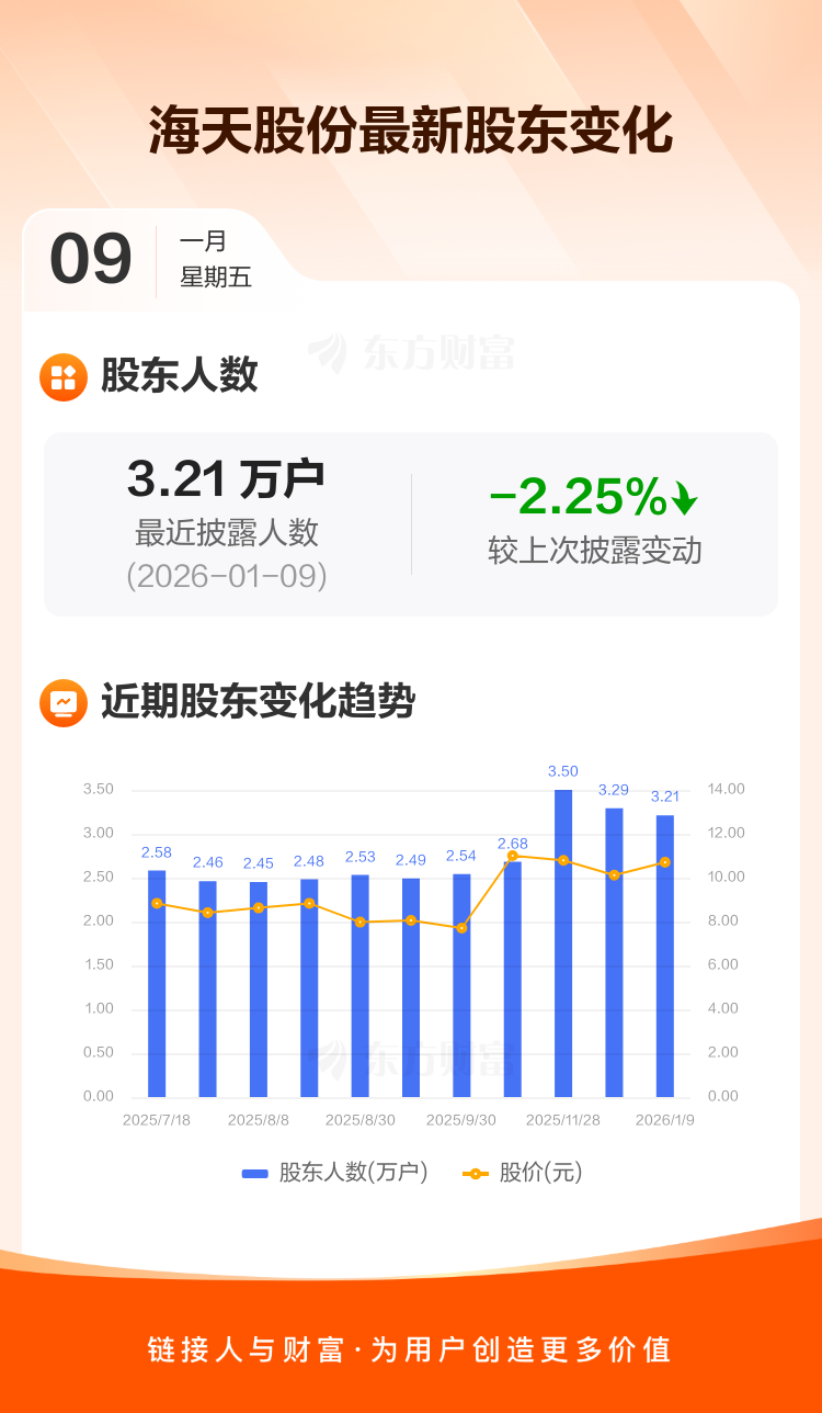 海天股份:截至1月9日最新股东户数3.21万户,较上期减少2.25%