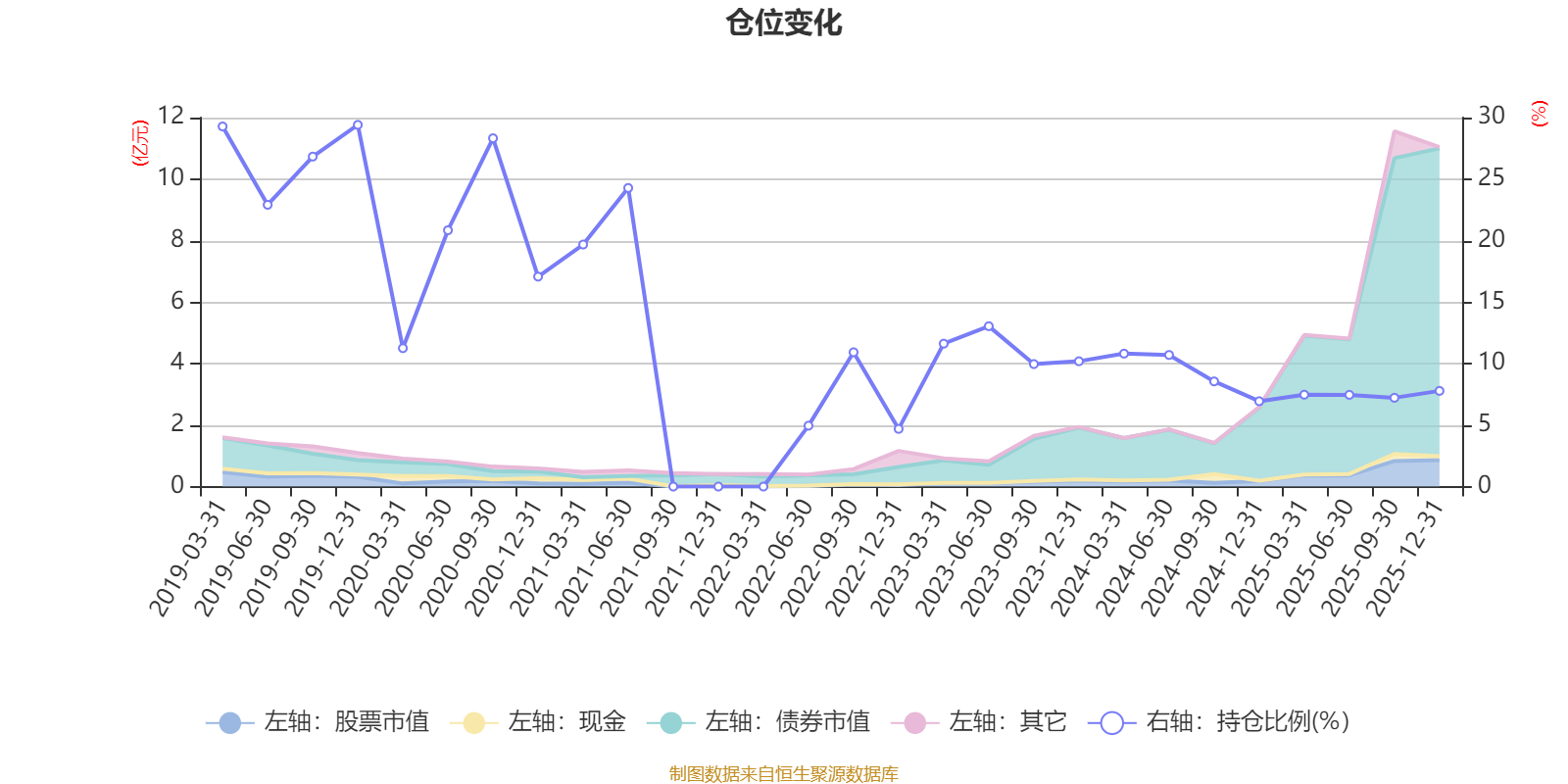 据定期报告数据统计,近三年平均股票仓位为9.31%,同类平均为72.57%。2019年末基金达到29.41%的最高仓位,2022年末最低,为4.69%。