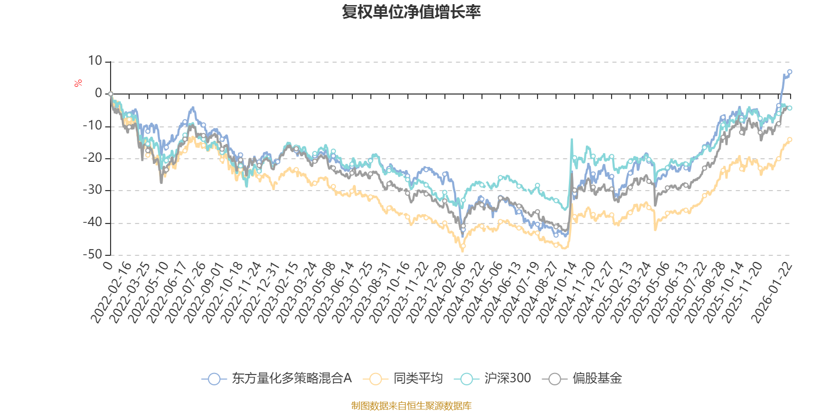 截至1月22日,东方量化多策略混合A近三个月复权单位净值增长率为15.66%,位于同类可比基金144/689;近半年复权单位净值增长率为27.79%,位于同类可比基金278/689;近一年复权单位净值增长率为50.17%,位于同类可比基金191/673;近三年复权单位净值增长率为26.65%,位于同类可比基金130/396。