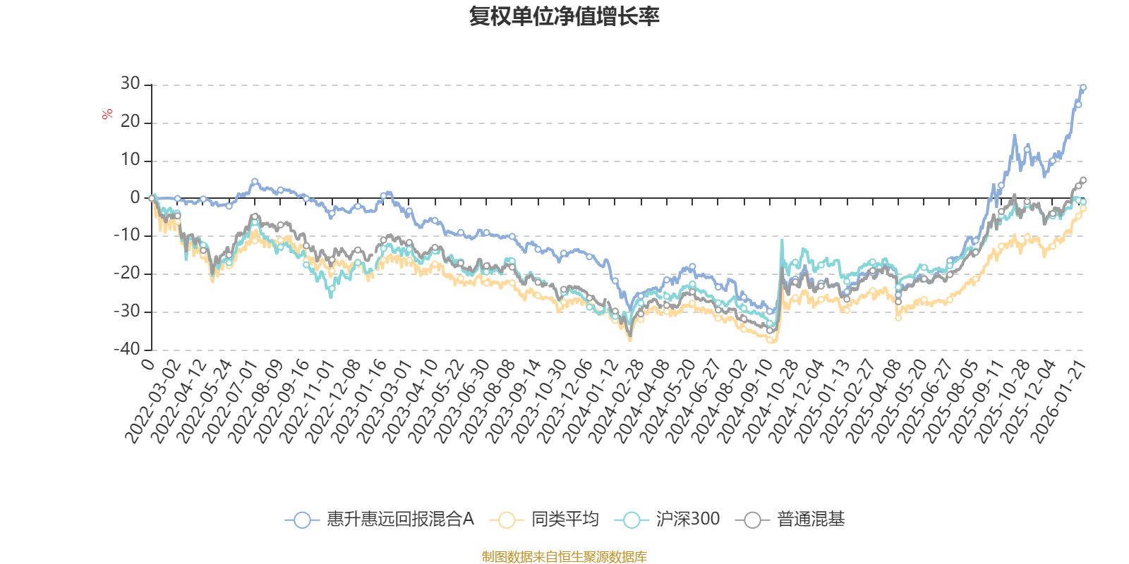 截至1月21日,惠升惠远回报混合A近三个月复权单位净值增长率为17.77%,位于同类可比基金13/134;近半年复权单位净值增长率为47.29%,位于同类可比基金8/134;近一年复权单位净值增长率为66.15%,位于同类可比基金11/131;近三年复权单位净值增长率为27.17%,位于同类可比基金40/124。