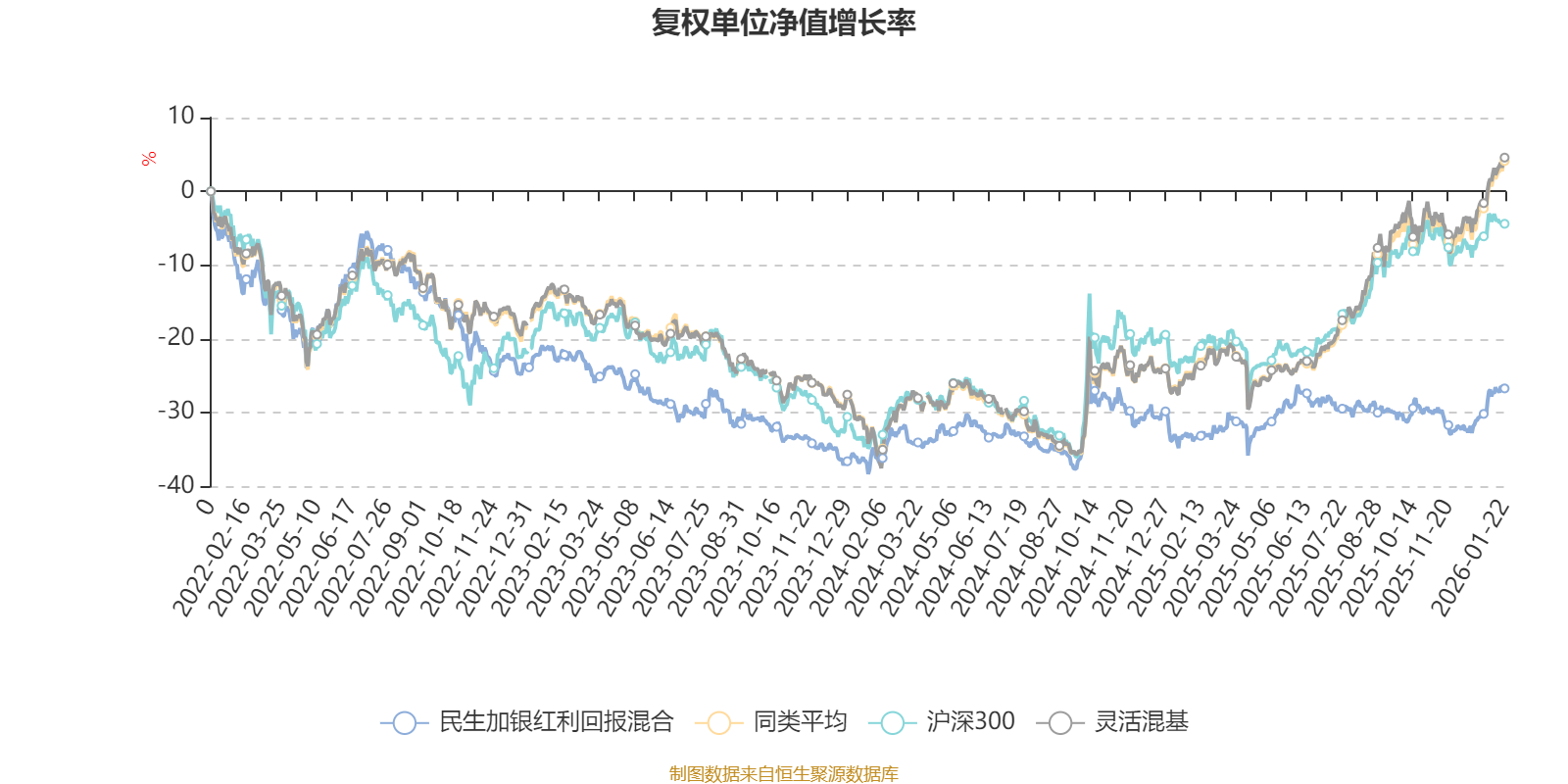 截至1月22日,民生加银红利回报混合近三个月复权单位净值增长率为4.13%,位于同类可比基金903/1286;近半年复权单位净值增长率为3.88%,位于同类可比基金1100/1286;近一年复权单位净值增长率为10.01%,位于同类可比基金1089/1286;近三年复权单位净值增长率为-7.07%,位于同类可比基金1103/1286。