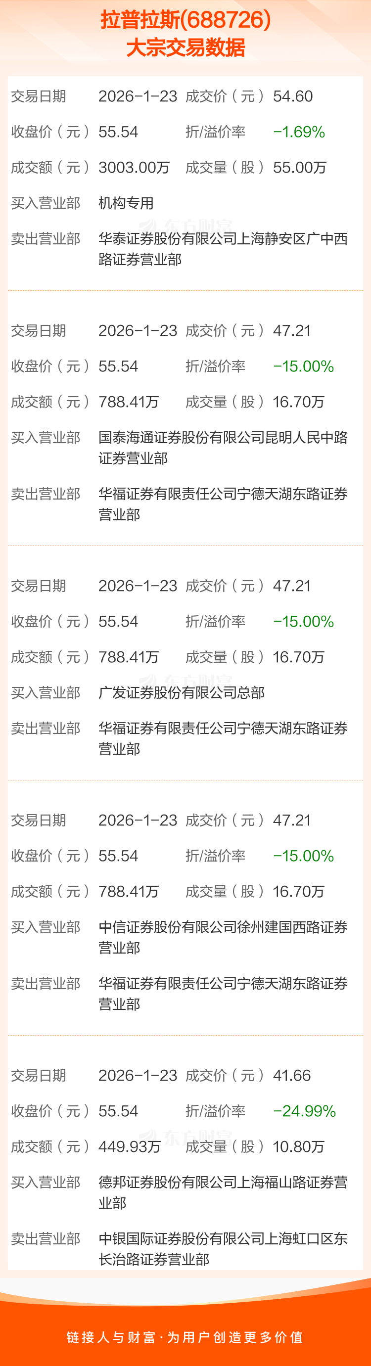 2026年1月23日,拉普拉斯发生5笔大宗交易,共成交115.90万股,成交金额5818.16万元,占其流通市值比例为0.48%。