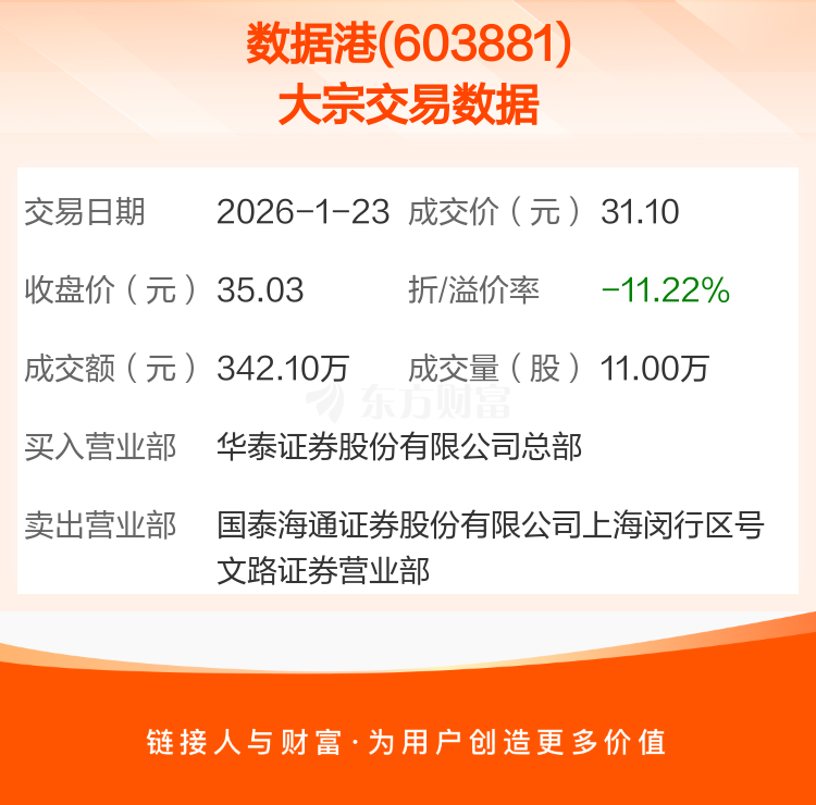 2026年1月23日,数据港发生1笔大宗交易,共成交11.00万股,成交金额342.10万元,占其流通市值比例为0.01%。