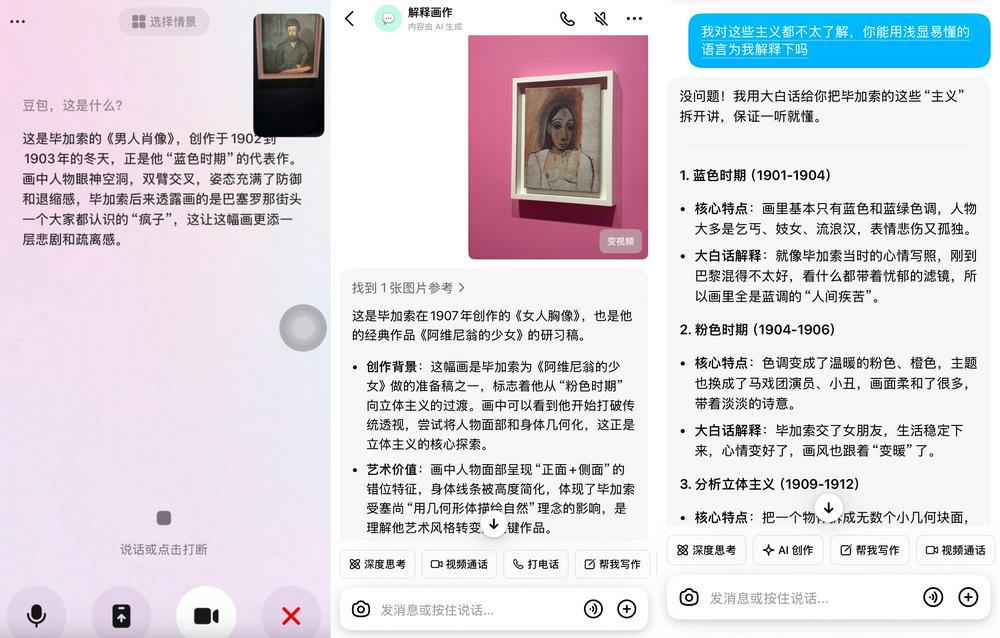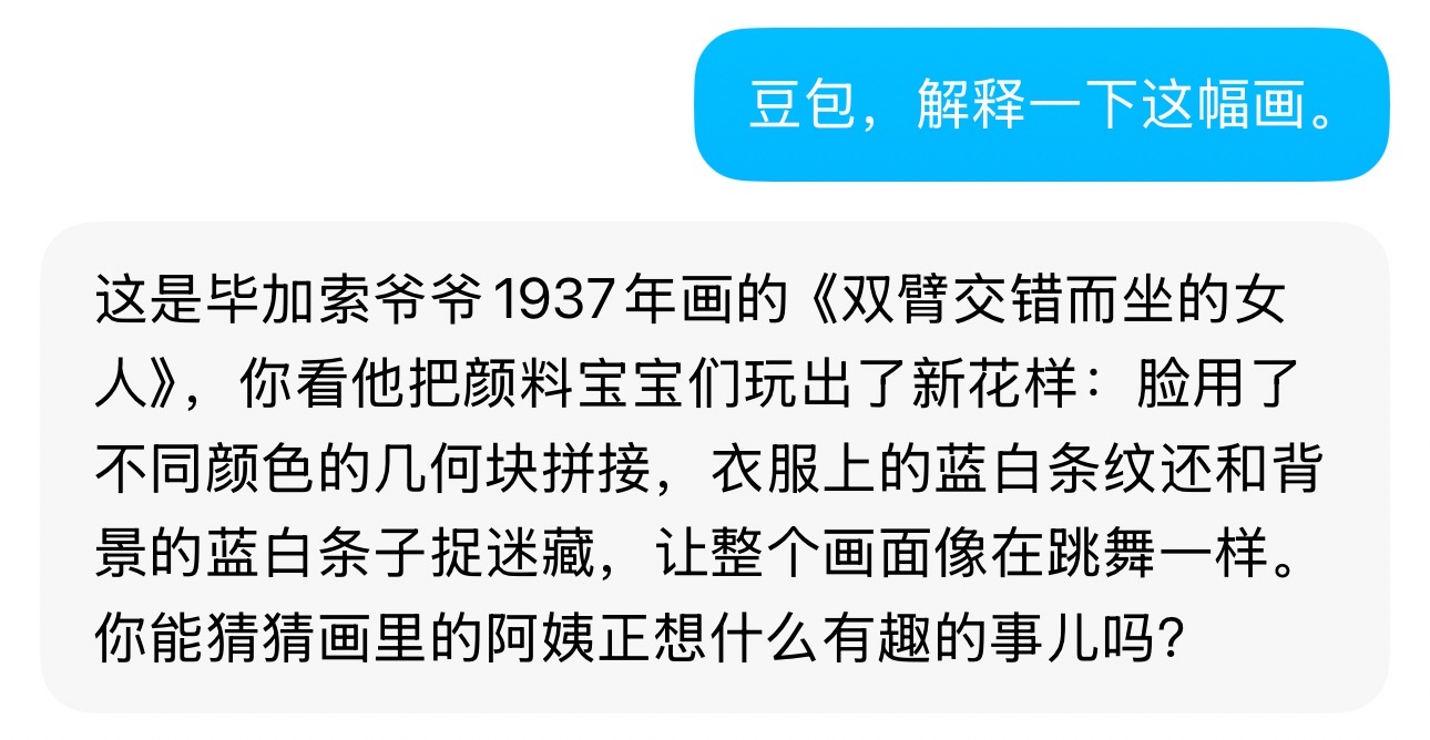 相比常规搜索到的内容,豆包看起来像个真的懂艺术、但没那么掉书袋的朋友。比如豆包会在讲解毕加索作品时提到粉色时期、提到巴黎艺术圈竞争激烈的背景;也会在用户要求大白话讲解时说明毕加索画风变暖是因为“交了女朋友、生活稳定下来”。