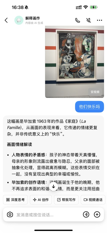 除了拍照或对话提问,豆包也支持视频通话——它能通过镜头“看到”面前的美术馆与展品并回答提问。它思考的时间通常只有几秒,即便是轻声提问也能准确识别。记者实测发现,豆包可以从创作背景、艺术价值、历史背景、表达意图、材质工艺等角度解读作品。