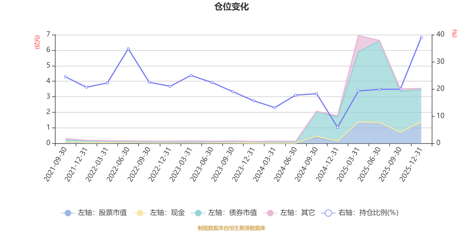 据定期报告数据统计,近三年平均股票仓位为19.6%,同类平均为19.2%。2025年末基金达到38.96%的最高仓位,2024年末最低,为5.92%。