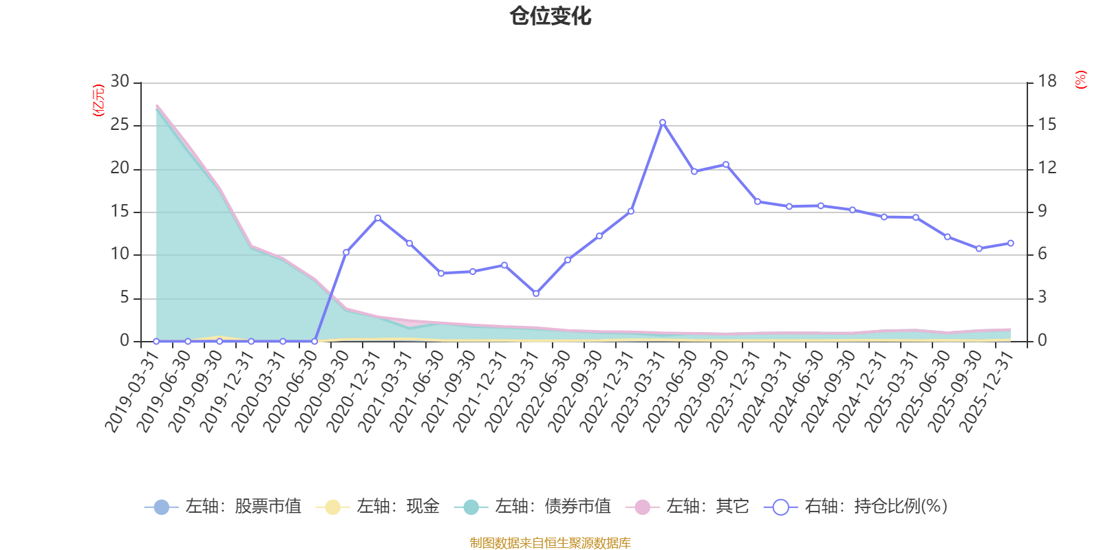 据定期报告数据统计,近三年平均股票仓位为9.57%,同类平均为72.57%。2023年一季度末基金达到15.23%的最高仓位,2022年一季度末最低,为3.33%。