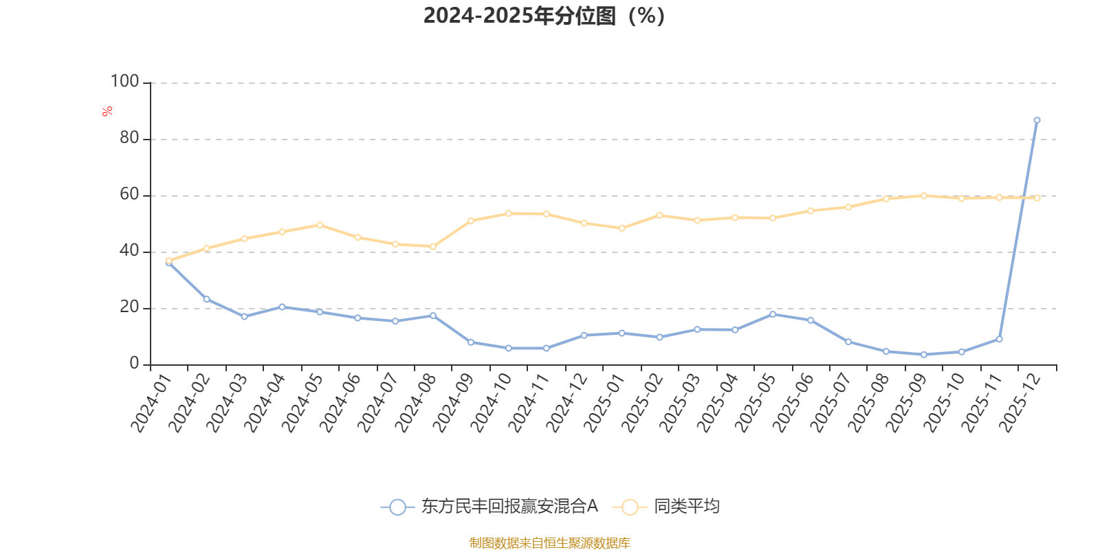 通过所选区间该基金净值增长率分位图,可以观察该基金与同类基金业绩比较情况。图为坐标原点到区间内某时点的净值增长率在同类基金中的分位数。