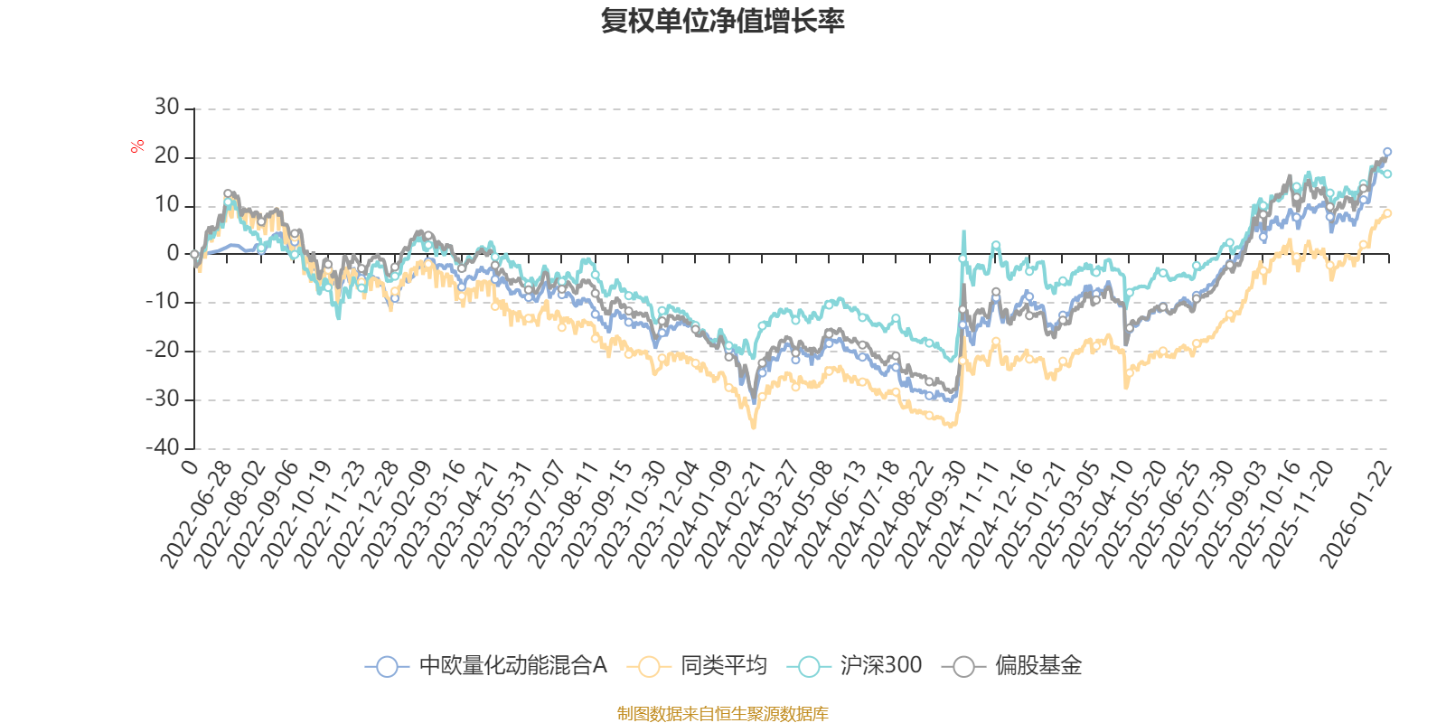 截至1月22日,中欧量化动能混合A近三个月复权单位净值增长率为12.77%,位于同类可比基金170/621;近半年复权单位净值增长率为24.86%,位于同类可比基金303/621;近一年复权单位净值增长率为39.05%,位于同类可比基金320/613;近三年复权单位净值增长率为25.25%,位于同类可比基金200/535。