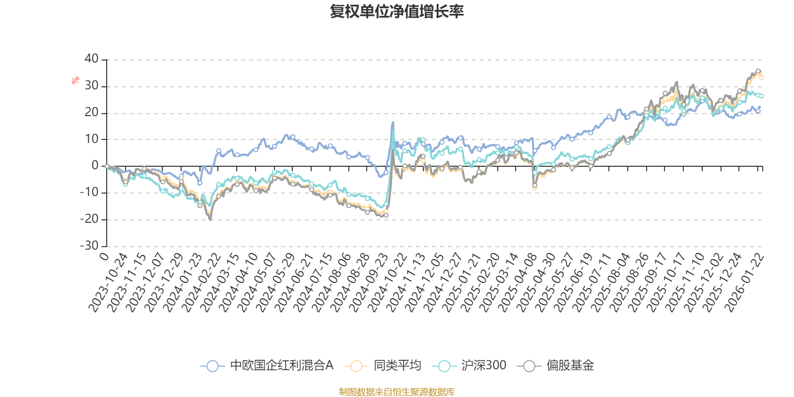 截至1月21日,中欧国企红利混合A近三个月复权单位净值增长率为1.33%,位于同类可比基金600/689;近半年复权单位净值增长率为2.46%,位于同类可比基金638/689;近一年复权单位净值增长率为14.49%,位于同类可比基金608/673。