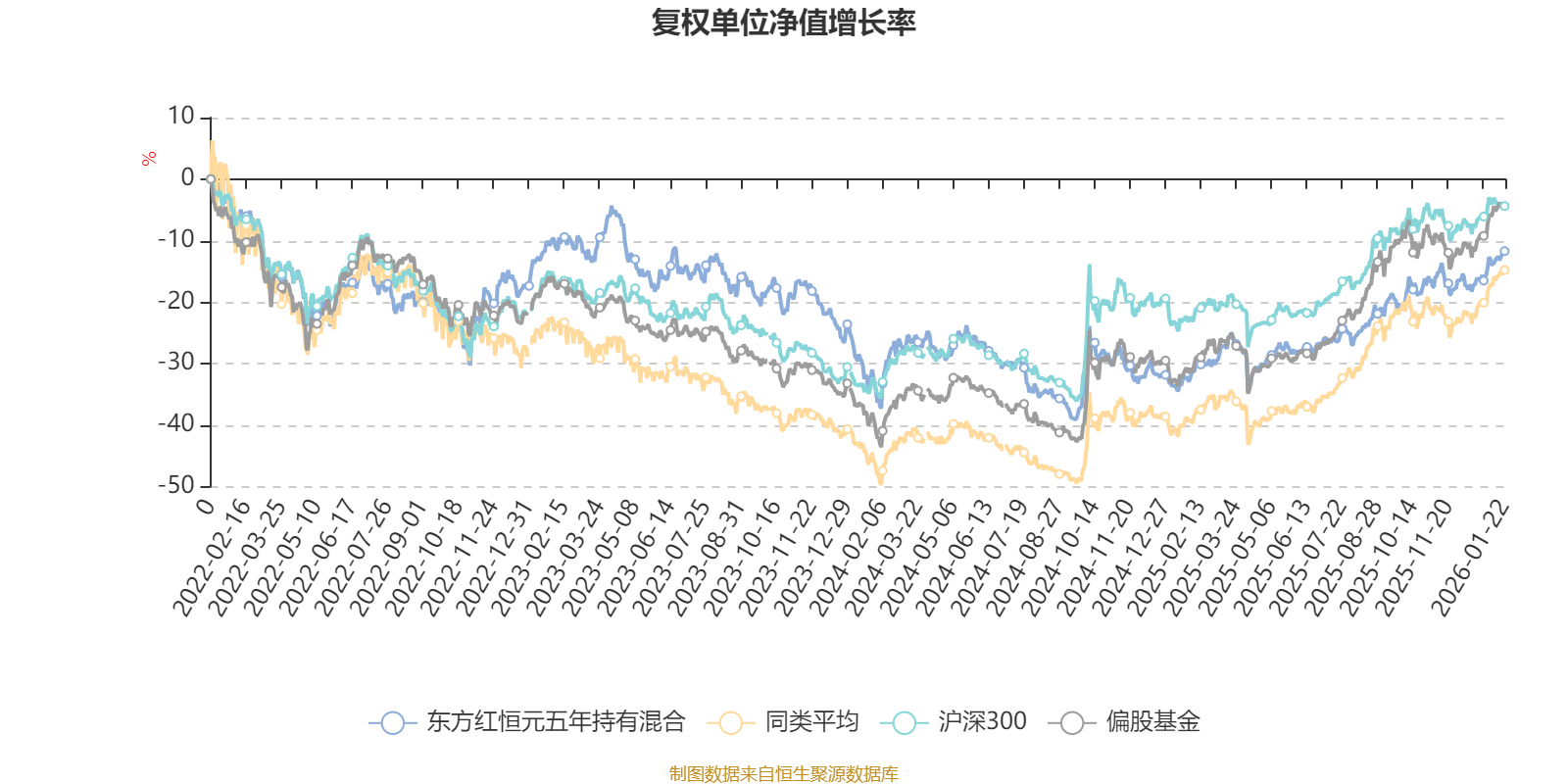 截至1月22日,东方红恒元五年持有混合近三个月复权单位净值增长率为8.68%,位于同类可比基金338/621;近半年复权单位净值增长率为16.71%,位于同类可比基金447/621;近一年复权单位净值增长率为30.99%,位于同类可比基金419/613;近三年复权单位净值增长率为-1.74%,位于同类可比基金423/535。