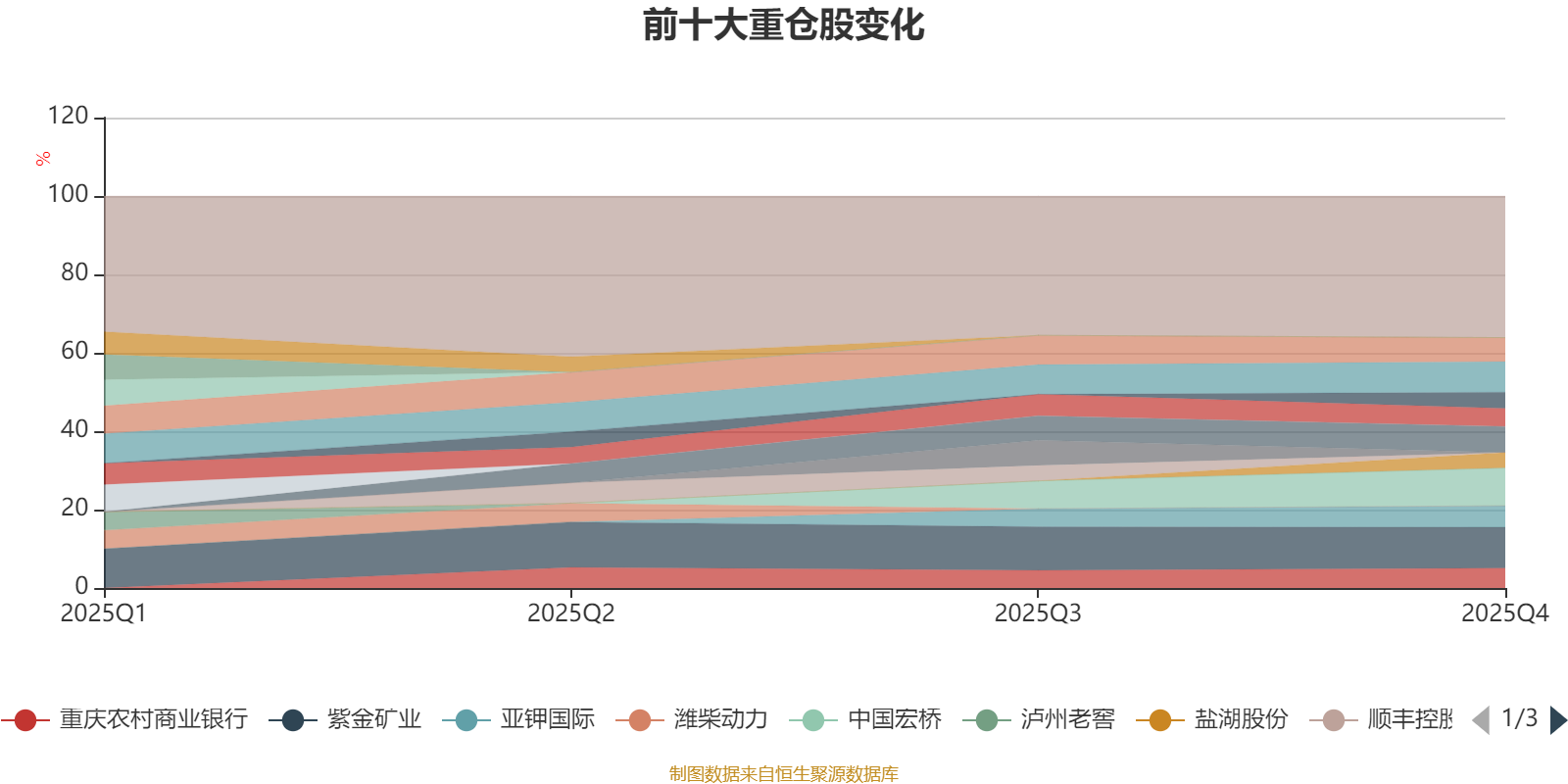 该基金持股集中度较高。截至2025年四季度末,基金十大重仓股分别是紫金矿业、中国宏桥、美的集团、宝丰能源、珀莱雅、亚钾国际、重庆农村商业银行、腾讯控股、中信银行、盐湖股份。