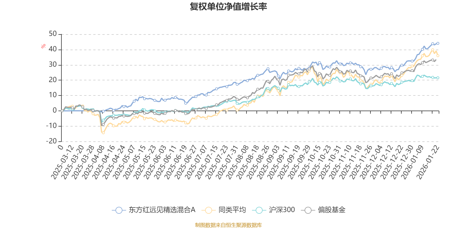 截至1月22日,东方红远见精选混合A近三个月复权单位净值增长率为12.16%,位于同类可比基金54/100;近半年复权单位净值增长率为24.15%,位于同类可比基金73/100。