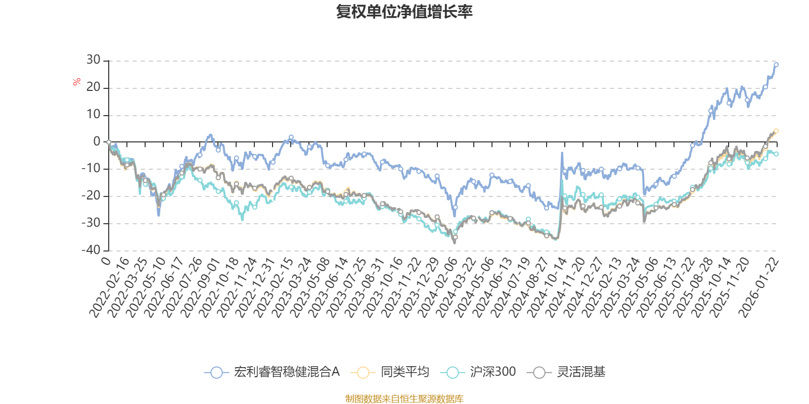 截至1月22日,宏利睿智稳健混合A近三个月复权单位净值增长率为12.13%,位于同类可比基金437/1286;近半年复权单位净值增长率为30.08%,位于同类可比基金442/1286;近一年复权单位净值增长率为43.32%,位于同类可比基金436/1286;近三年复权单位净值增长率为30.29%,位于同类可比基金383/1286。