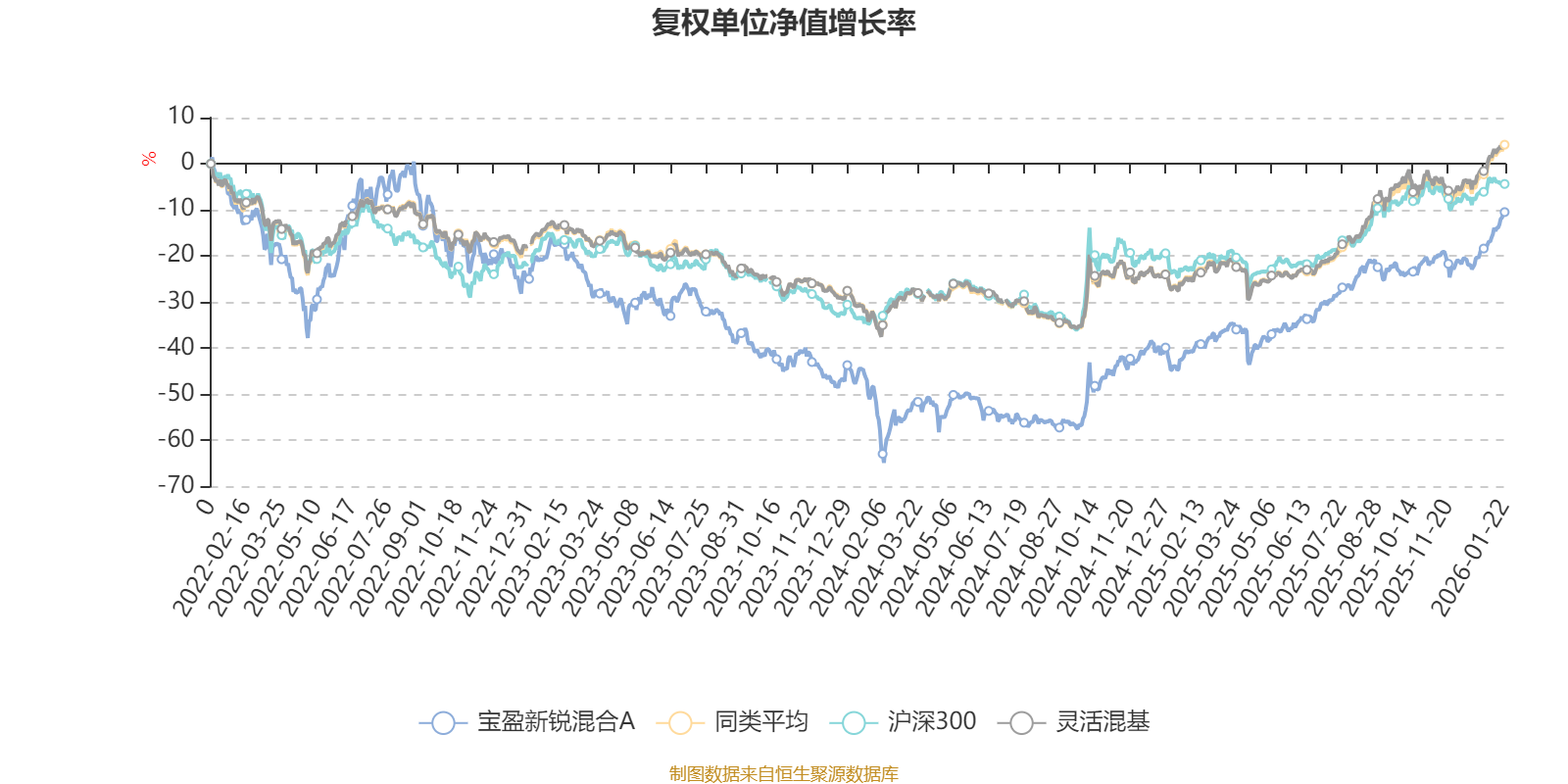 截至1月22日,宝盈新锐混合A近三个月复权单位净值增长率为14.47%,位于同类可比基金315/1286;近半年复权单位净值增长率为22.34%,位于同类可比基金624/1286;近一年复权单位净值增长率为51.38%,位于同类可比基金318/1286;近三年复权单位净值增长率为11.34%,位于同类可比基金764/1286。