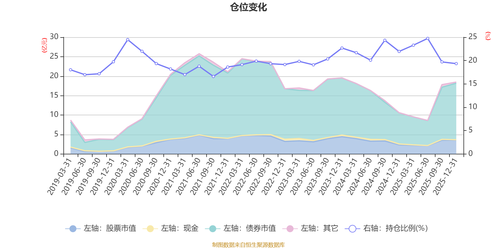 据定期报告数据统计,近三年平均股票仓位为21.42%,同类平均为19.2%。2025年上半年末基金达到24.74%的最高仓位,2021年三季度末最低,为16.59%。