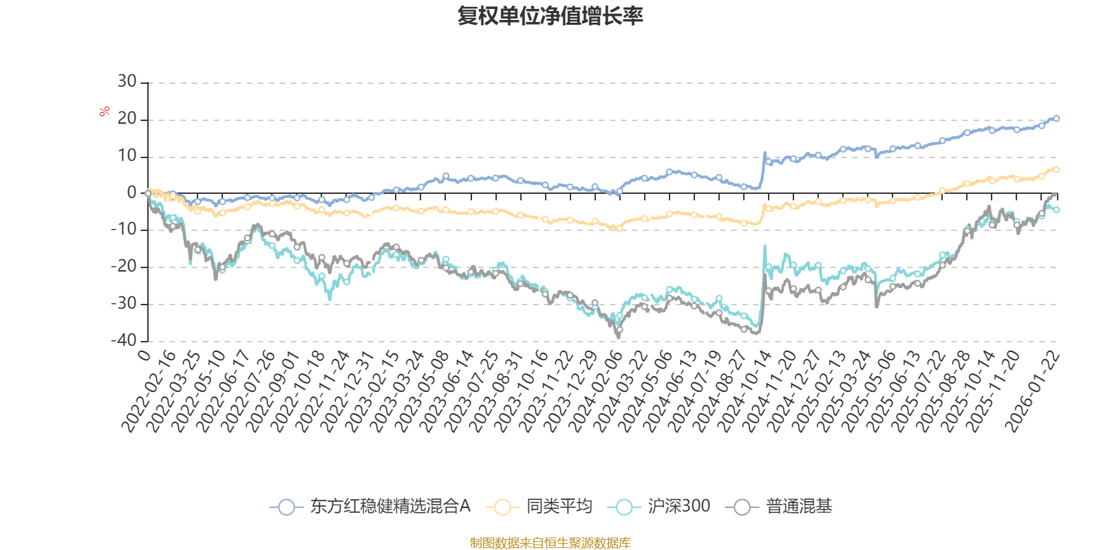 截至1月22日,东方红稳健精选混合A近三个月复权单位净值增长率为2.66%,位于同类可比基金234/629;近半年复权单位净值增长率为5.24%,位于同类可比基金254/629;近一年复权单位净值增长率为8.84%,位于同类可比基金257/626;近三年复权单位净值增长率为19.25%,位于同类可比基金94/564。
