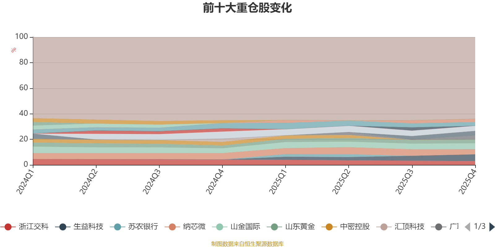 截至2025年四季度末,基金十大重仓股分别是生益科技、山金国际、纳芯微、安克创新、洛阳钼业、浙江交科、广联航空、山东黄金、明月镜片、德业股份。