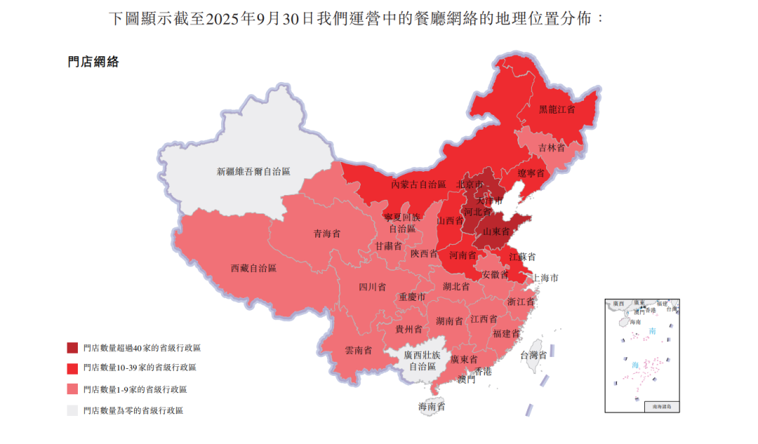 区域布局的“北强南弱”是比格餐饮最突出的竞争劣势。截至2025年9月30日,其342家门店高度集中于北方地区,北京、河北、山东等省份门店数均超过40家;而川渝、云贵及沿海的上海、浙江、福建、广东等十余南方地区,门店数均未超过10家。