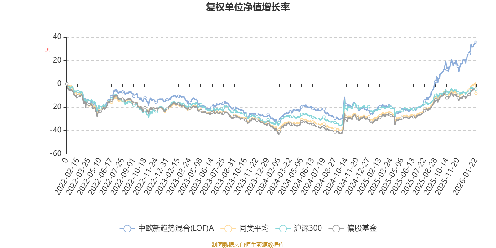 截至1月22日,中欧新趋势混合(LOF)A近三个月复权单位净值增长率为18.75%,位于同类可比基金5/130;近半年复权单位净值增长率为58.86%,位于同类可比基金7/130;近一年复权单位净值增长率为75.12%,位于同类可比基金12/130;近三年复权单位净值增长率为51.61%,位于同类可比基金19/125。