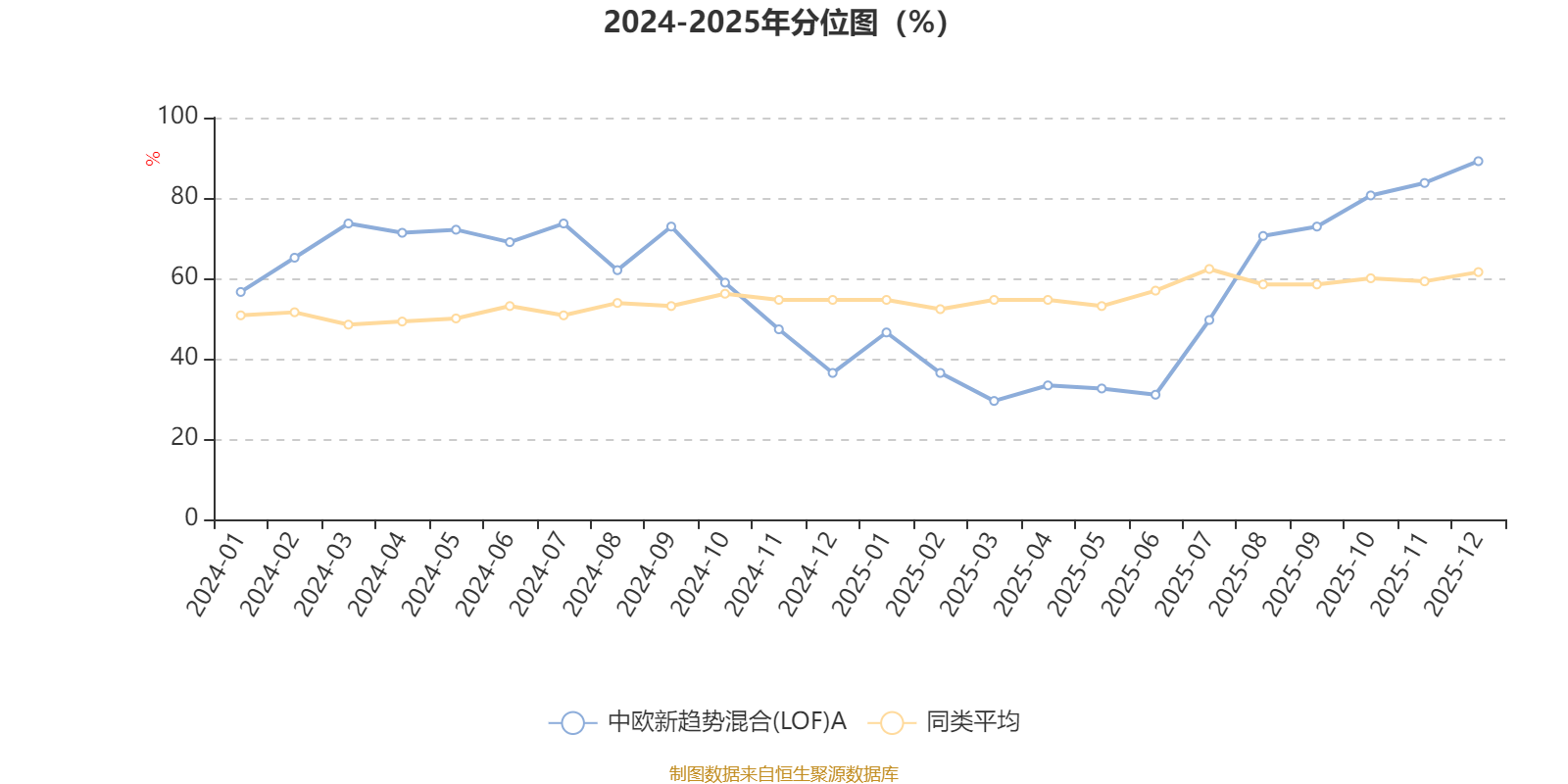 通过所选区间该基金净值增长率分位图,可以观察该基金与同类基金业绩比较情况。图为坐标原点到区间内某时点的净值增长率在同类基金中的分位数。