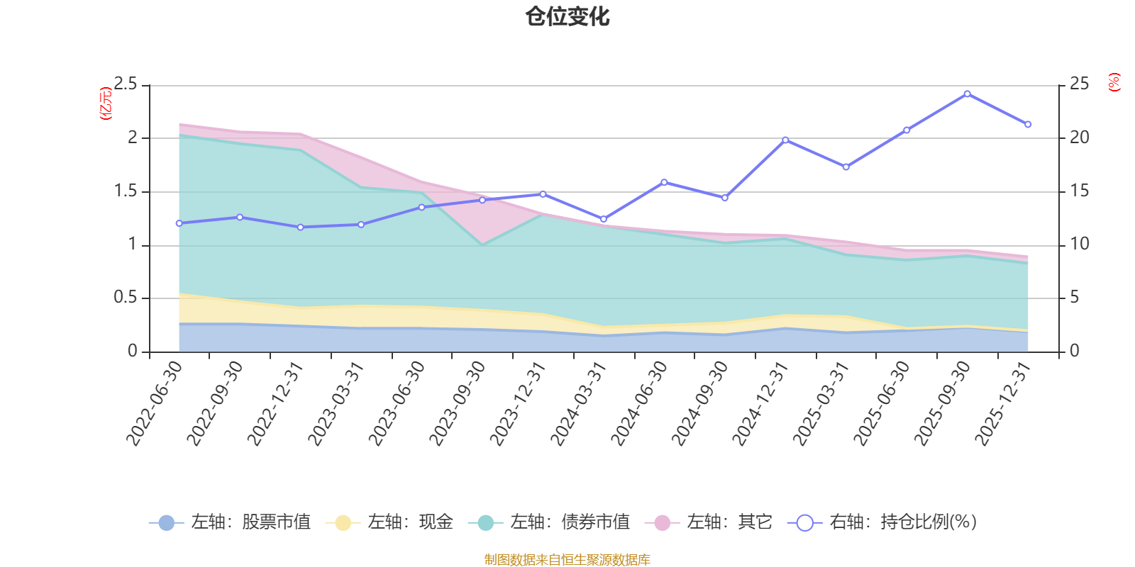 据定期报告数据统计,近三年平均股票仓位为16.73%,同类平均为19.2%。2025年三季度末基金达到24.18%的最高仓位,2022年末最低,为11.68%。