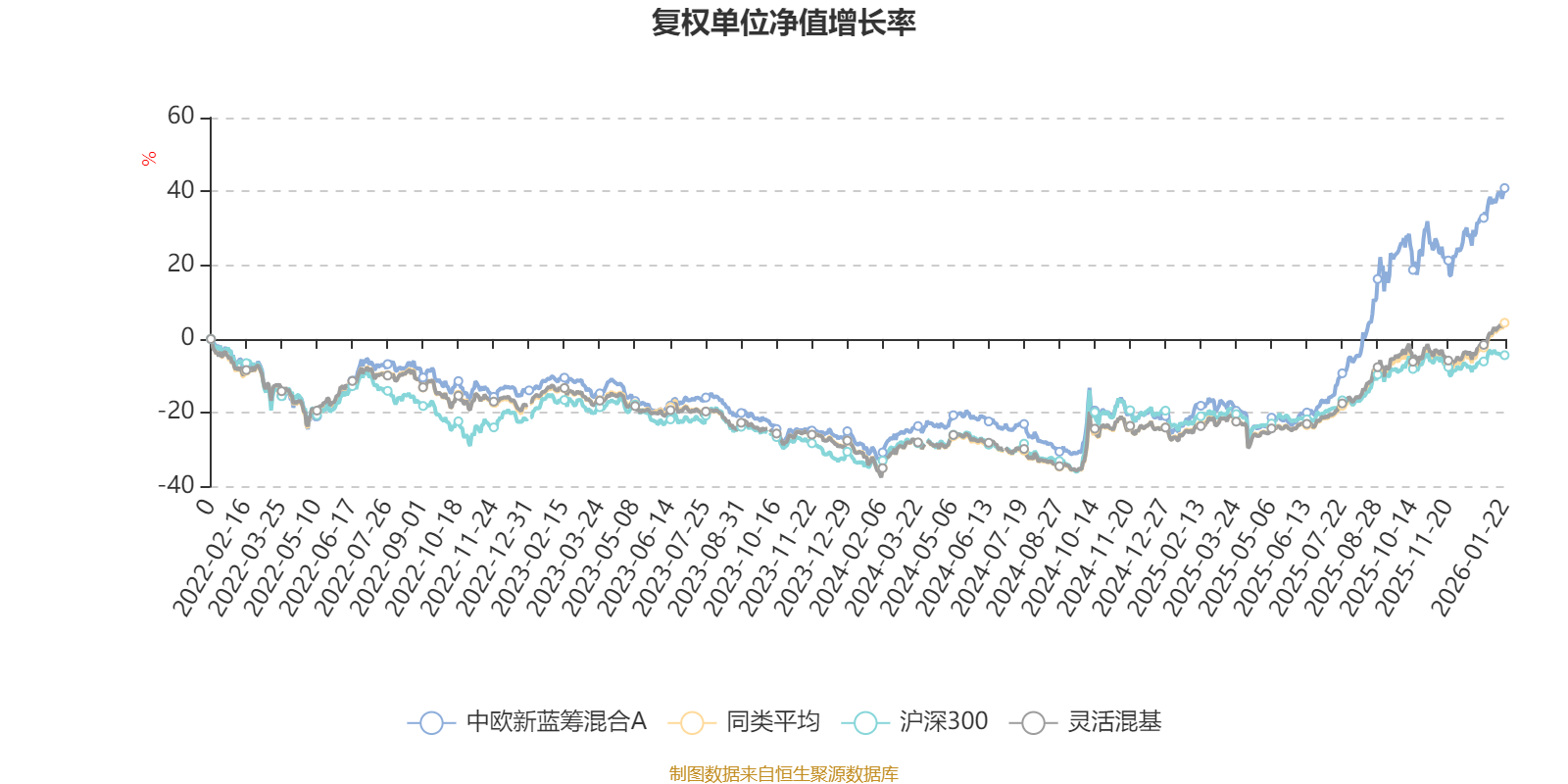 截至1月22日,中欧新蓝筹混合A近三个月复权单位净值增长率为13.68%,位于同类可比基金349/1286;近半年复权单位净值增长率为55.35%,位于同类可比基金114/1286;近一年复权单位净值增长率为80.23%,位于同类可比基金62/1286;近三年复权单位净值增长率为57.96%,位于同类可比基金130/1286。