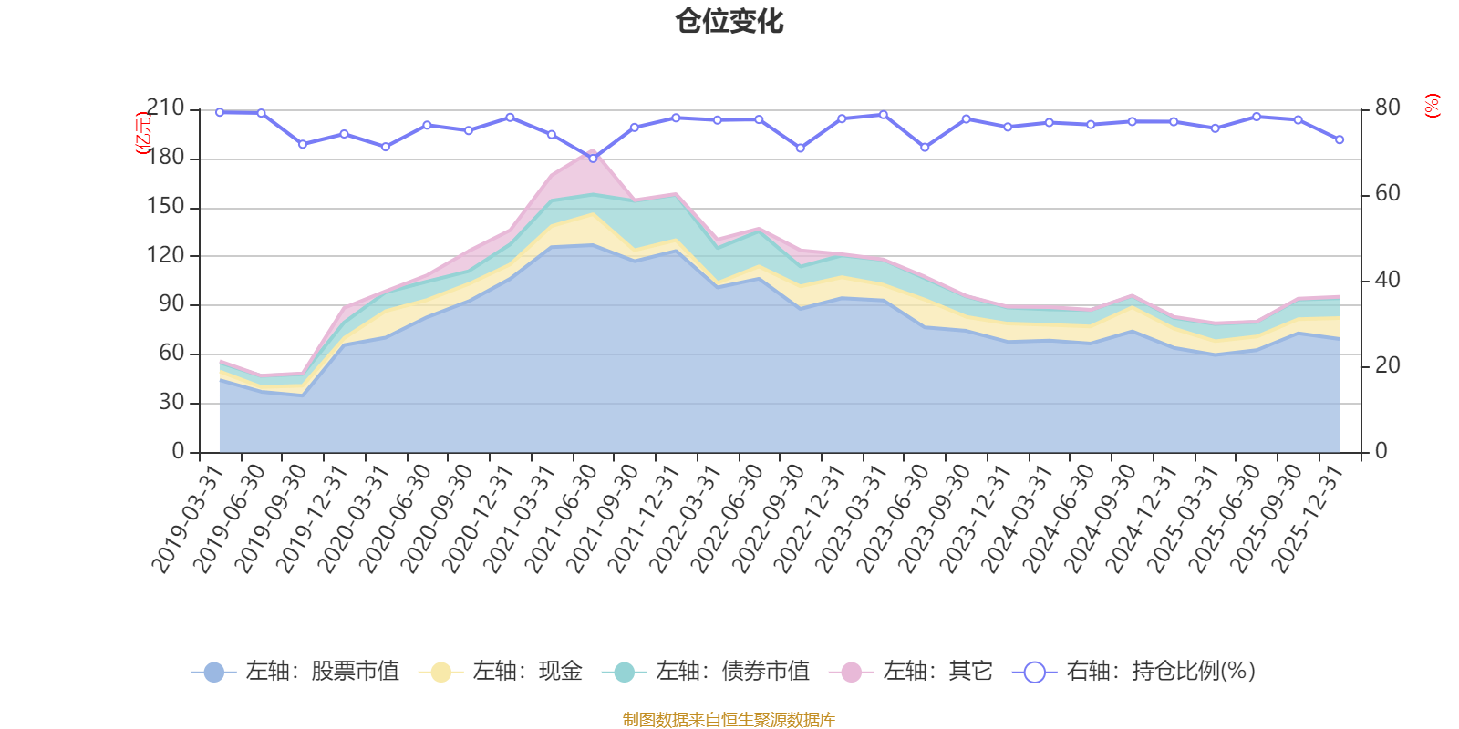 据定期报告数据统计,近三年平均股票仓位为76.3%,同类平均为72.57%。2019年一季度末基金达到79.32%的最高仓位,2021年上半年末最低,为68.55%。