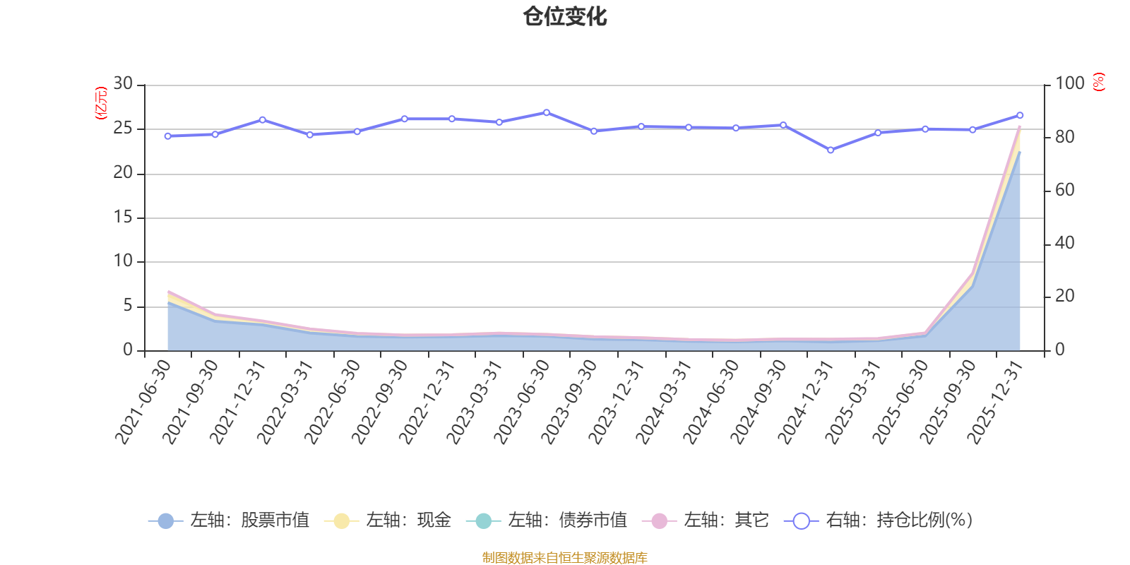 据定期报告数据统计,近三年平均股票仓位为83.94%,同类平均为85.83%。2023年上半年末基金达到89.56%的最高仓位,2024年末最低,为75.45%。