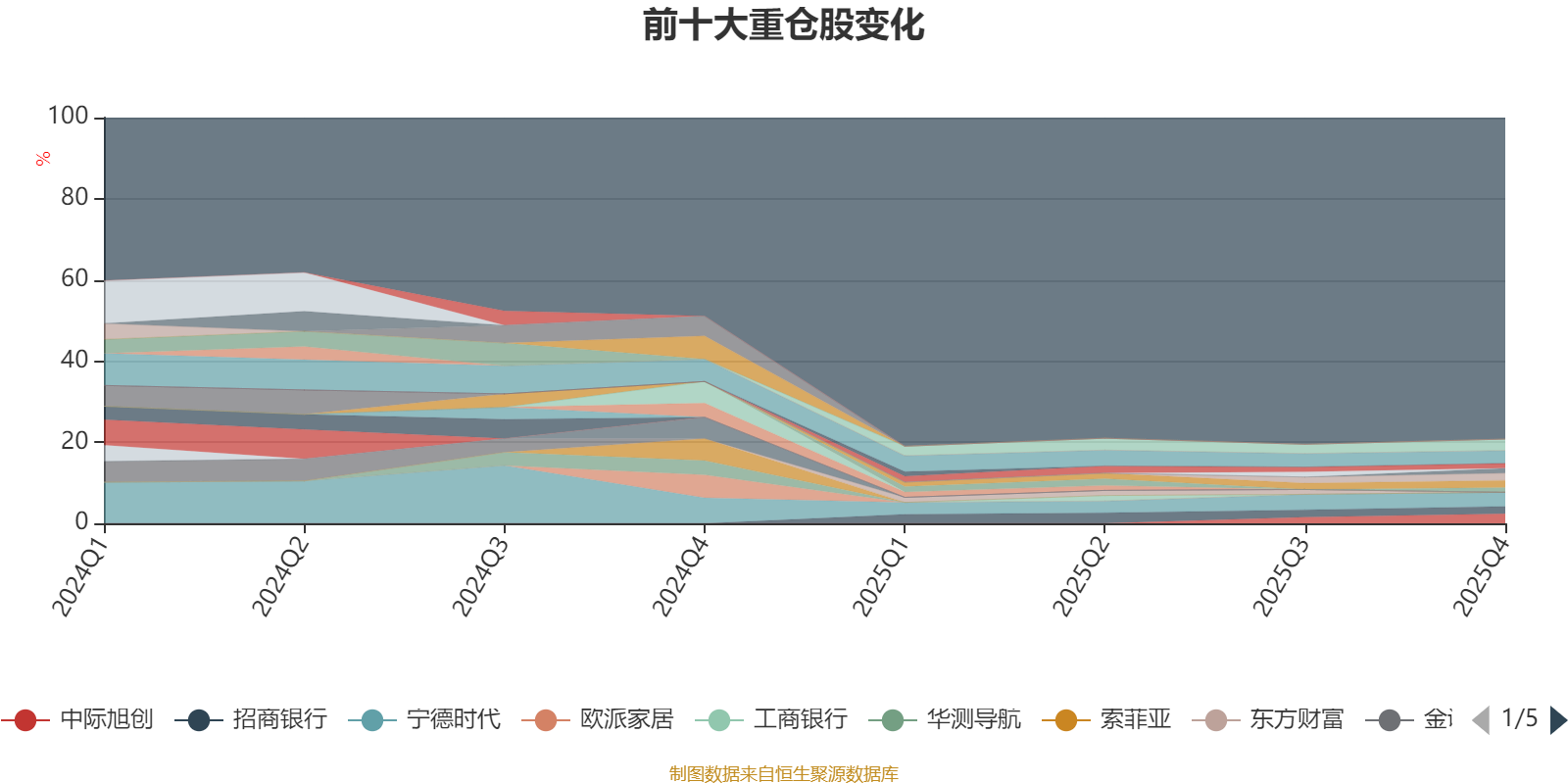 截至2025年四季度末,基金十大重仓股分别是宁德时代、贵州茅台、中国平安、中际旭创、招商银行、紫金矿业、新易盛、长江电力、寒武纪、兴业银行。