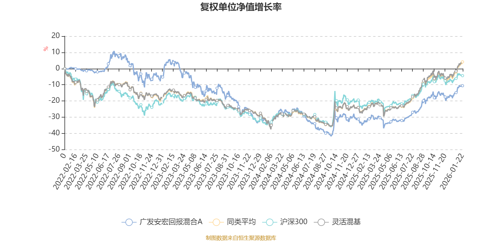 截至1月22日,广发安宏回报混合A近三个月复权单位净值增长率为8.06%,位于同类可比基金681/1286;近半年复权单位净值增长率为22.39%,位于同类可比基金621/1286;近一年复权单位净值增长率为32.71%,位于同类可比基金635/1286;近三年复权单位净值增长率为-14.28%,位于同类可比基金1177/1286。