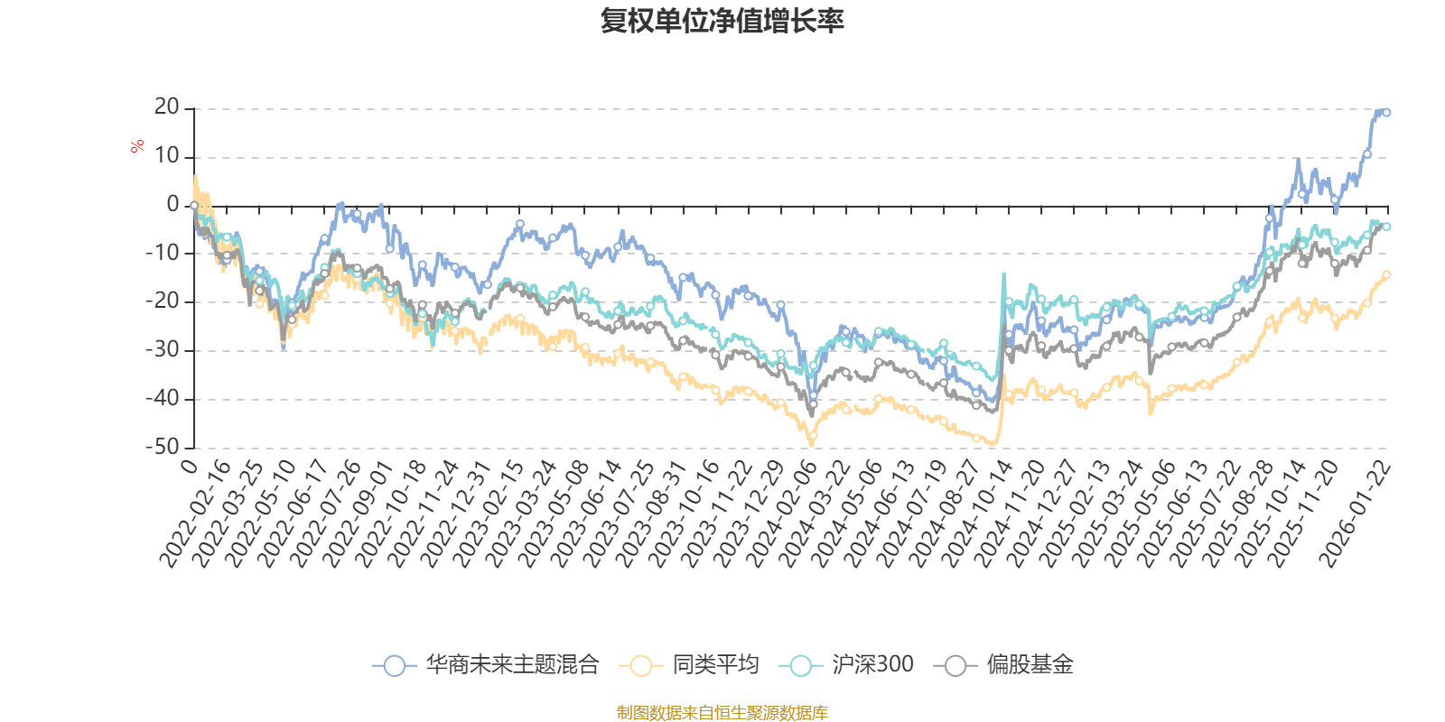 截至1月22日,华商未来主题混合近三个月复权单位净值增长率为15.86%,位于同类可比基金98/621;近半年复权单位净值增长率为43.34%,位于同类可比基金88/621;近一年复权单位净值增长率为62.30%,位于同类可比基金96/613;近三年复权单位净值增长率为30.81%,位于同类可比基金165/535。