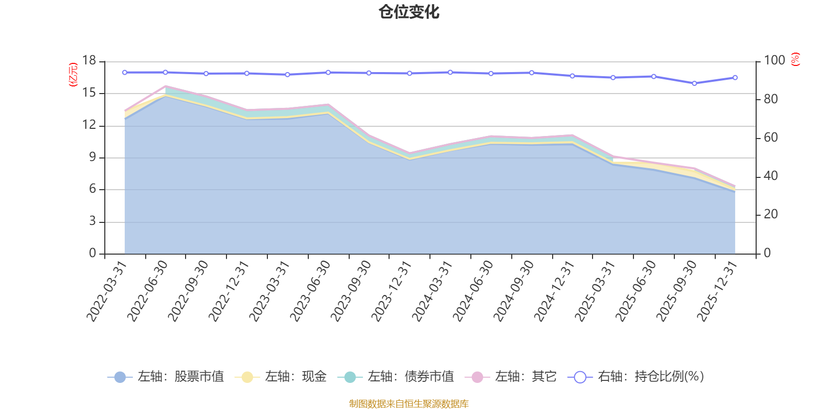 据定期报告数据统计,近三年平均股票仓位为92.79%,同类平均为86.9%。2022年上半年末基金达到94.31%的最高仓位,2025年三季度末最低,为88.56%。