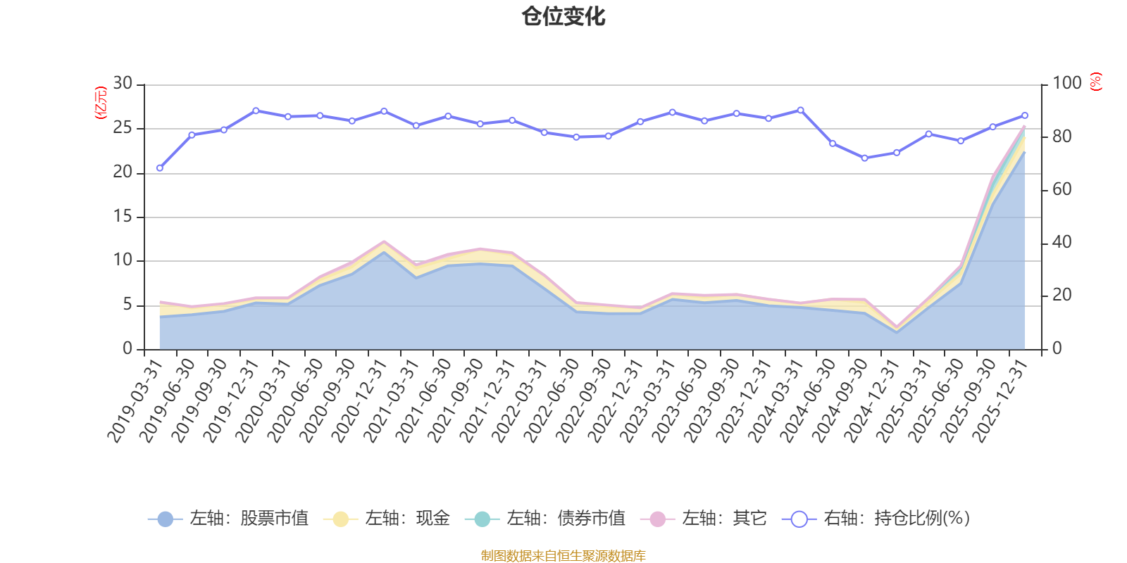 据定期报告数据统计,近三年平均股票仓位为83.24%,同类平均为72.57%。2024年一季度末基金达到90.31%的最高仓位,2019年一季度末最低,为68.48%。