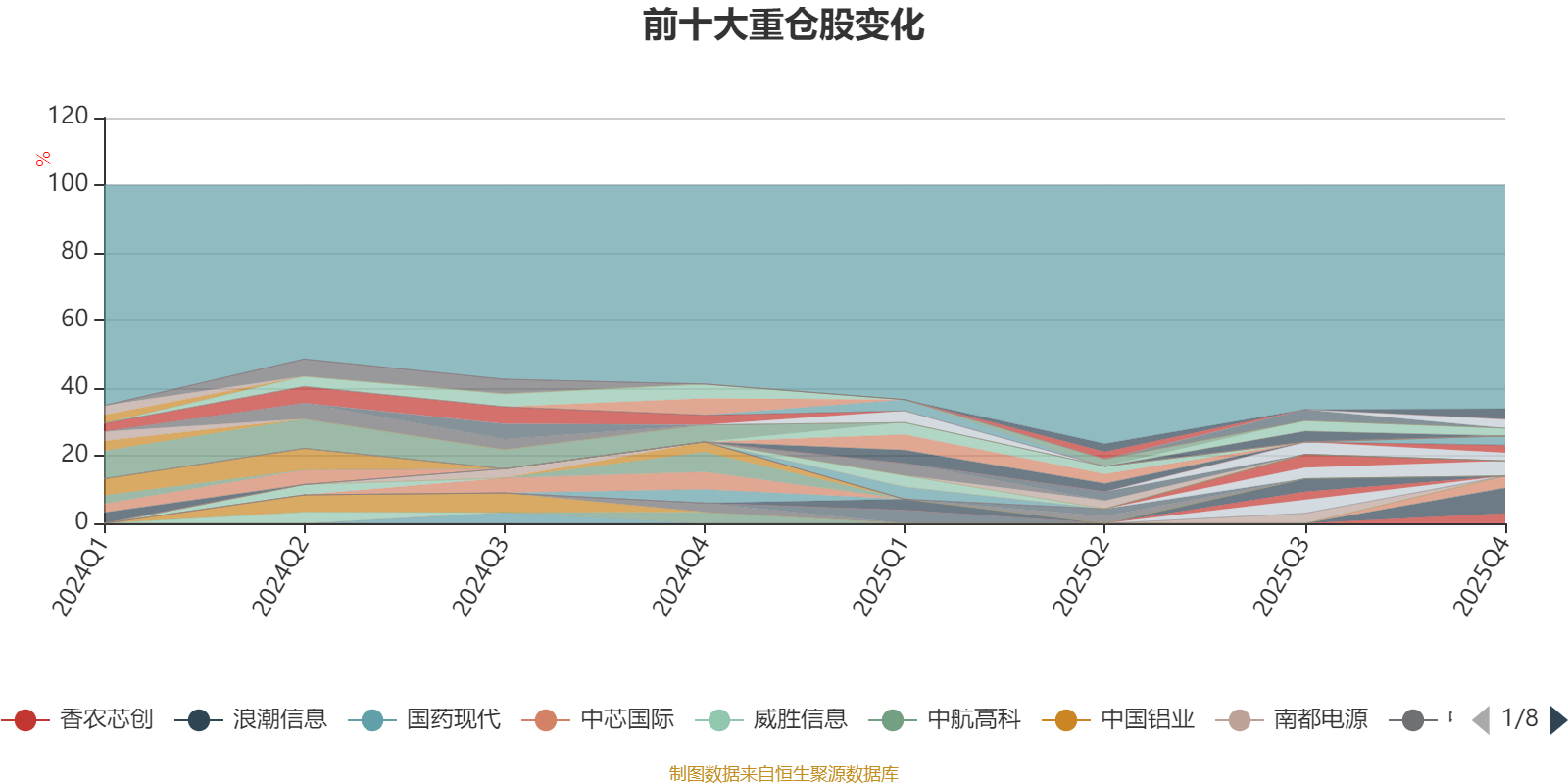 截至2025年四季度末,基金十大重仓股分别是浪潮信息、寒武纪、中芯国际、中银证券、香农芯创、新凤鸣、佰维存储、环旭电子、北方华创、华峰化学。