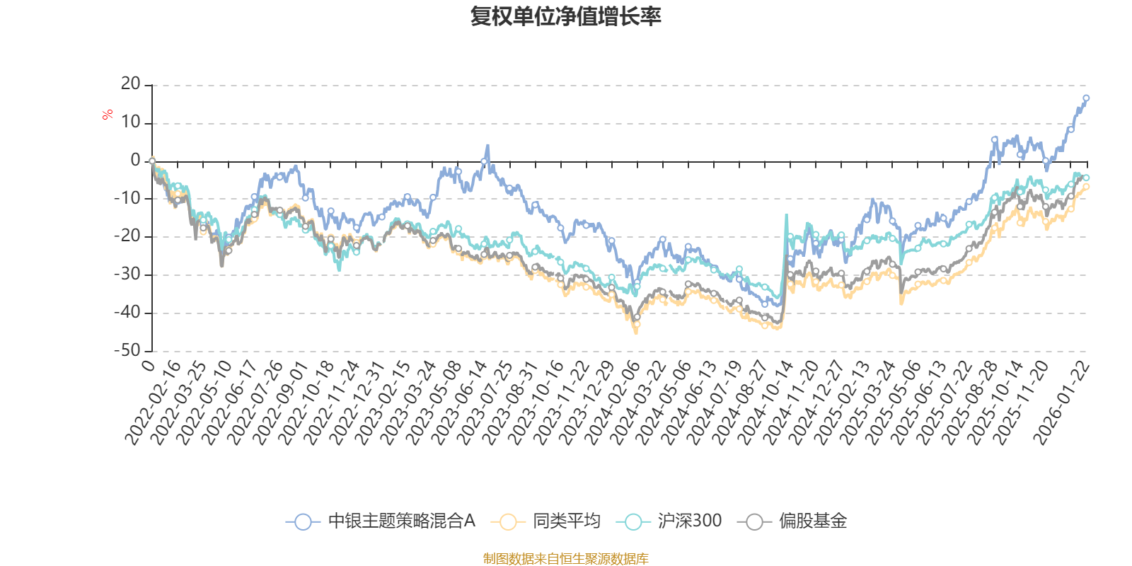 截至1月22日,中银主题策略混合A近三个月复权单位净值增长率为13.82%,位于同类可比基金37/185;近半年复权单位净值增长率为30.46%,位于同类可比基金58/185;近一年复权单位净值增长率为41.37%,位于同类可比基金88/183;近三年复权单位净值增长率为30.33%,位于同类可比基金44/176。