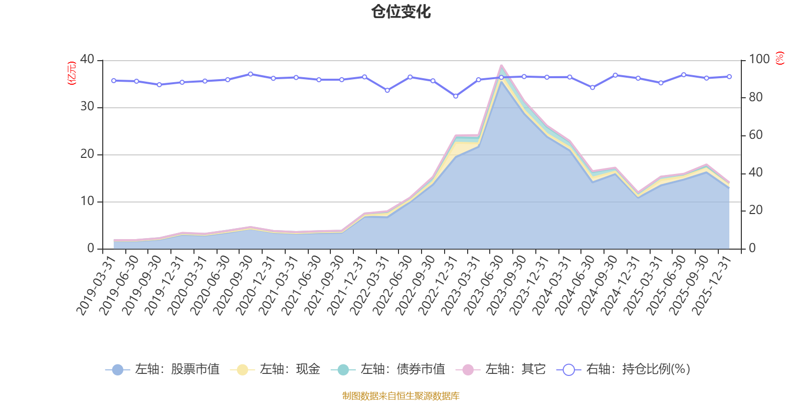 据定期报告数据统计,近三年平均股票仓位为90.32%,同类平均为87.64%。2020年三季度末基金达到92.64%的最高仓位,2022年末最低,为80.95%。