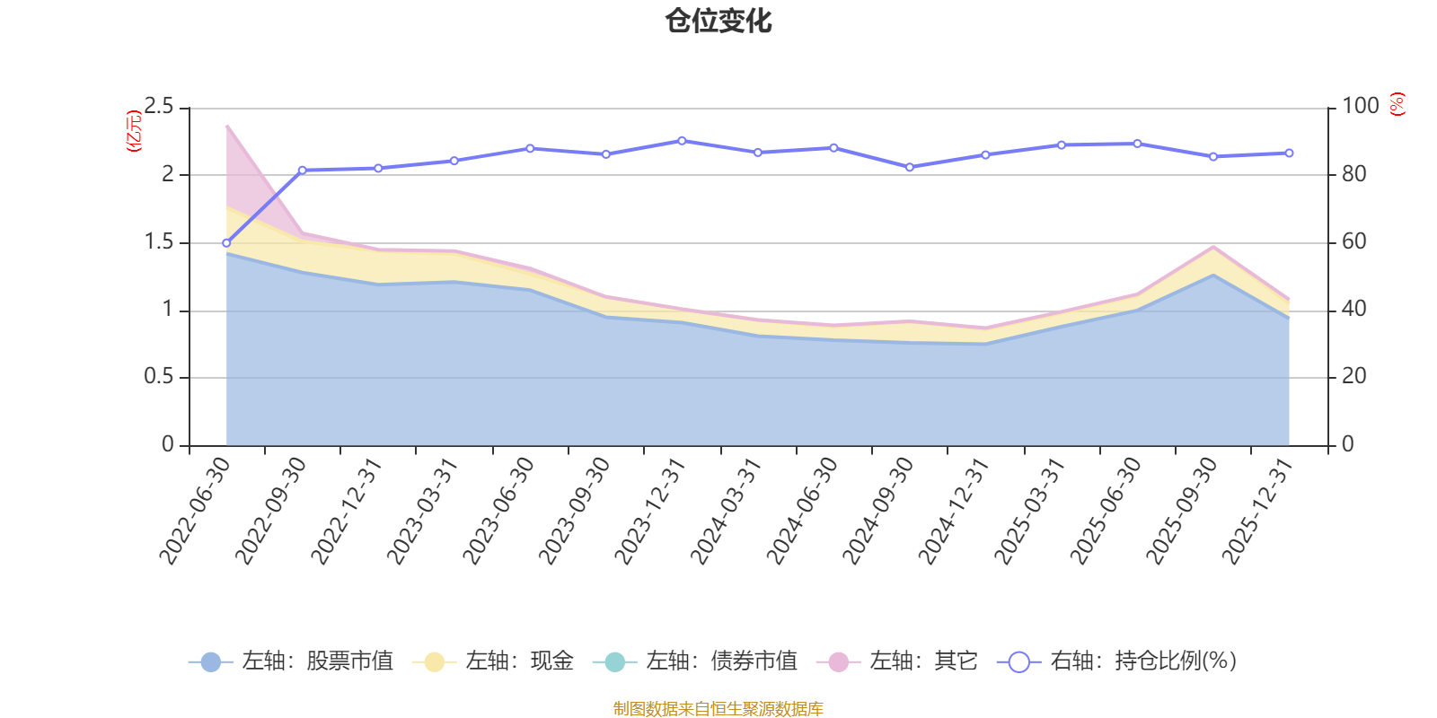 据定期报告数据统计,近三年平均股票仓位为86.87%,同类平均为85.83%。2023年末基金达到90.22%的最高仓位,2022年上半年末最低,为59.96%。