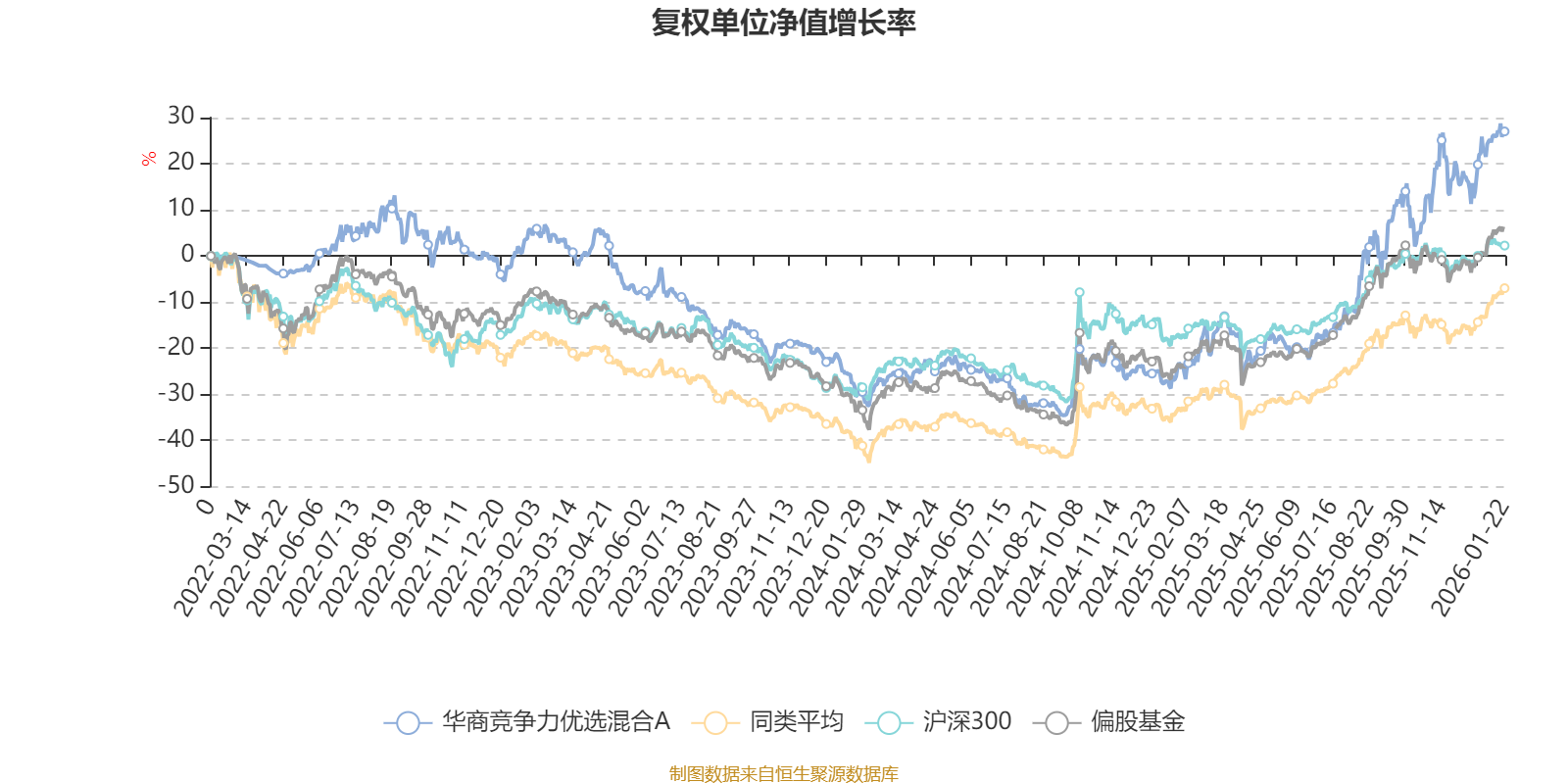 截至1月22日,华商竞争力优选混合A近三个月复权单位净值增长率为20.87%,位于同类可比基金69/689;近半年复权单位净值增长率为49.43%,位于同类可比基金74/689;近一年复权单位净值增长率为66.03%,位于同类可比基金78/673;近三年复权单位净值增长率为19.95%,位于同类可比基金169/396。